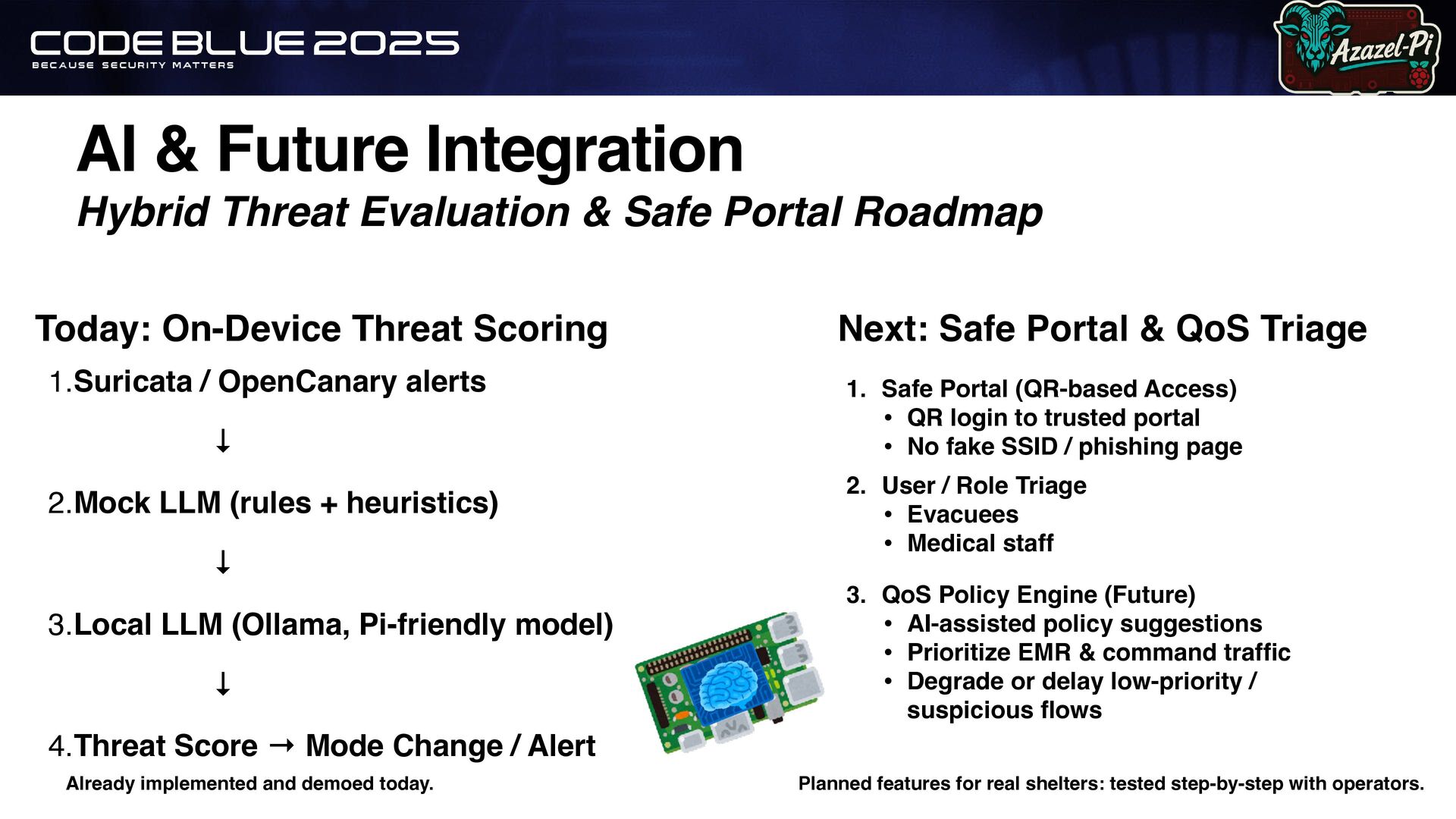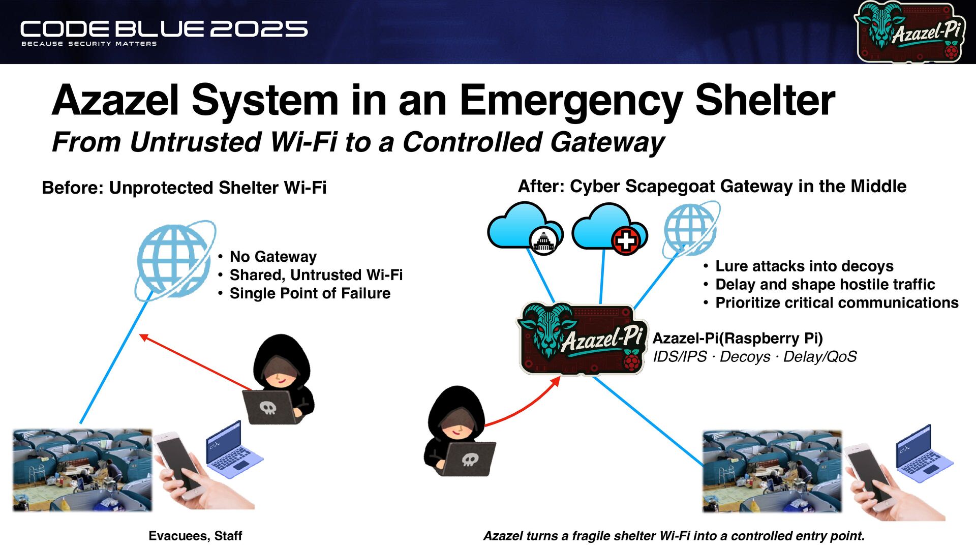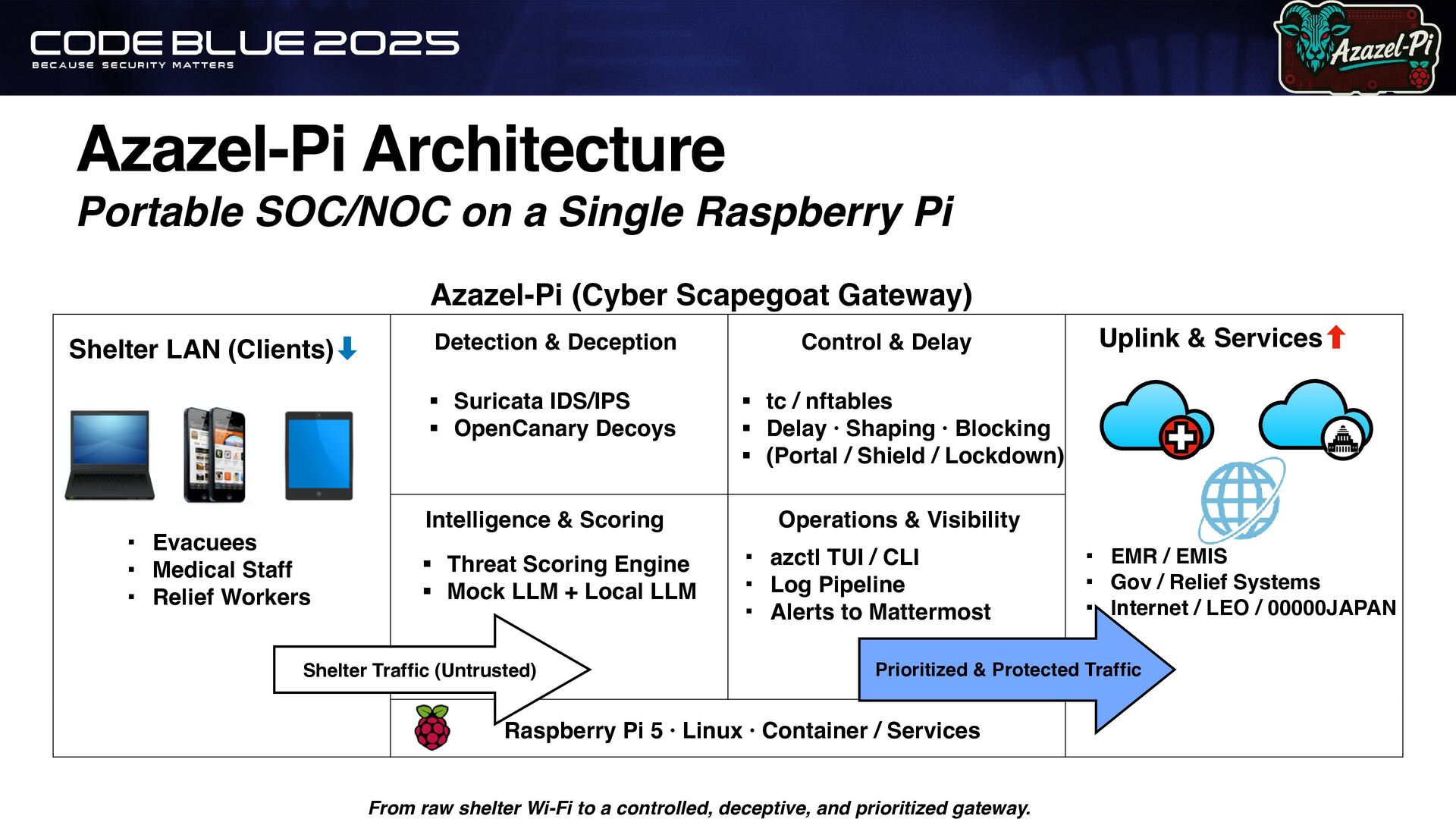 Azazel System for Emergency Shelters is a rapid-deploy, portable SOC/NOC built on a single Raspberry Pi, designed to turn fragile, untrusted evacuation-shelter Wi-Fi into a controlled gateway. It places a “Cyber Scapegoat Gateway” in the middle to lure attacks into decoys, delay/shape hostile traffic, and prioritize critical communications for evacuees and responders.