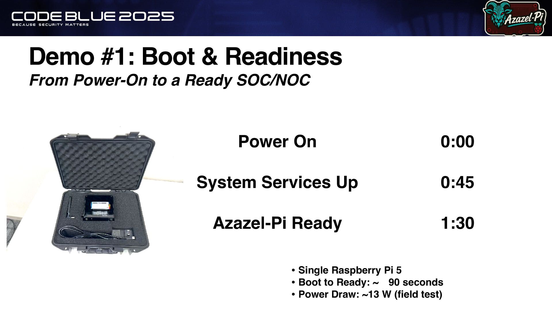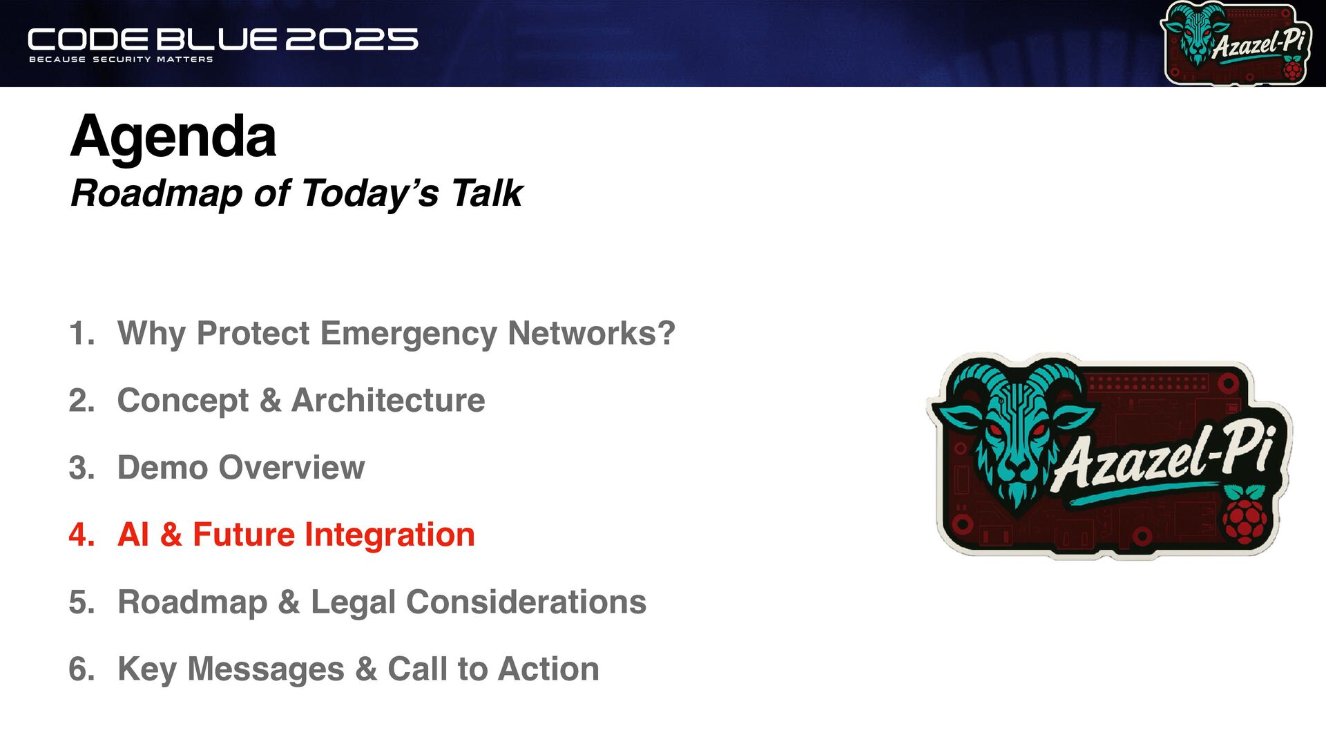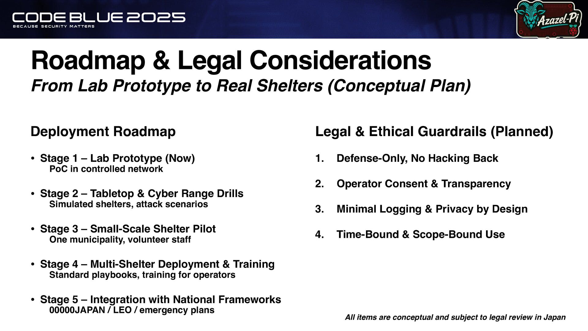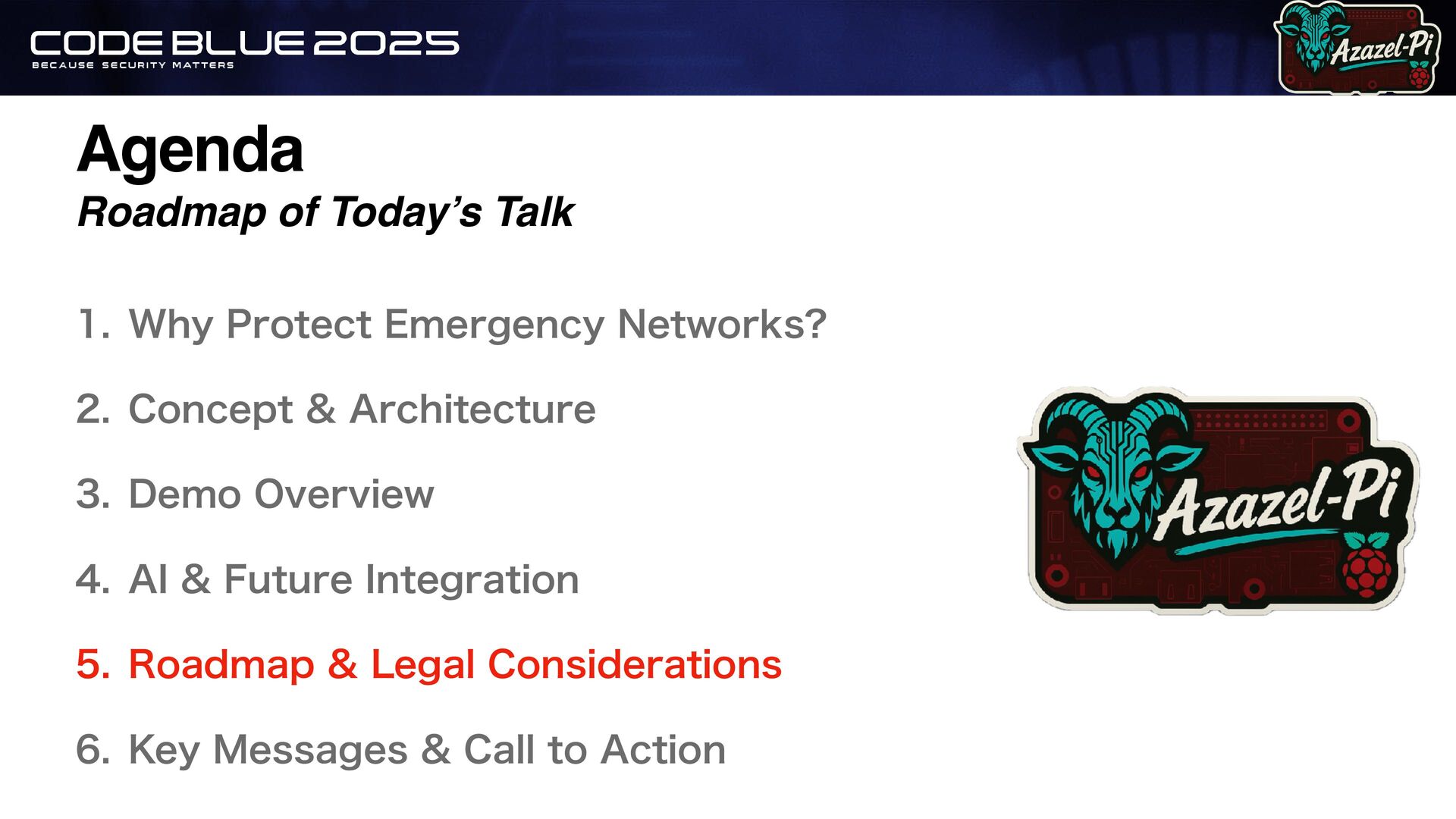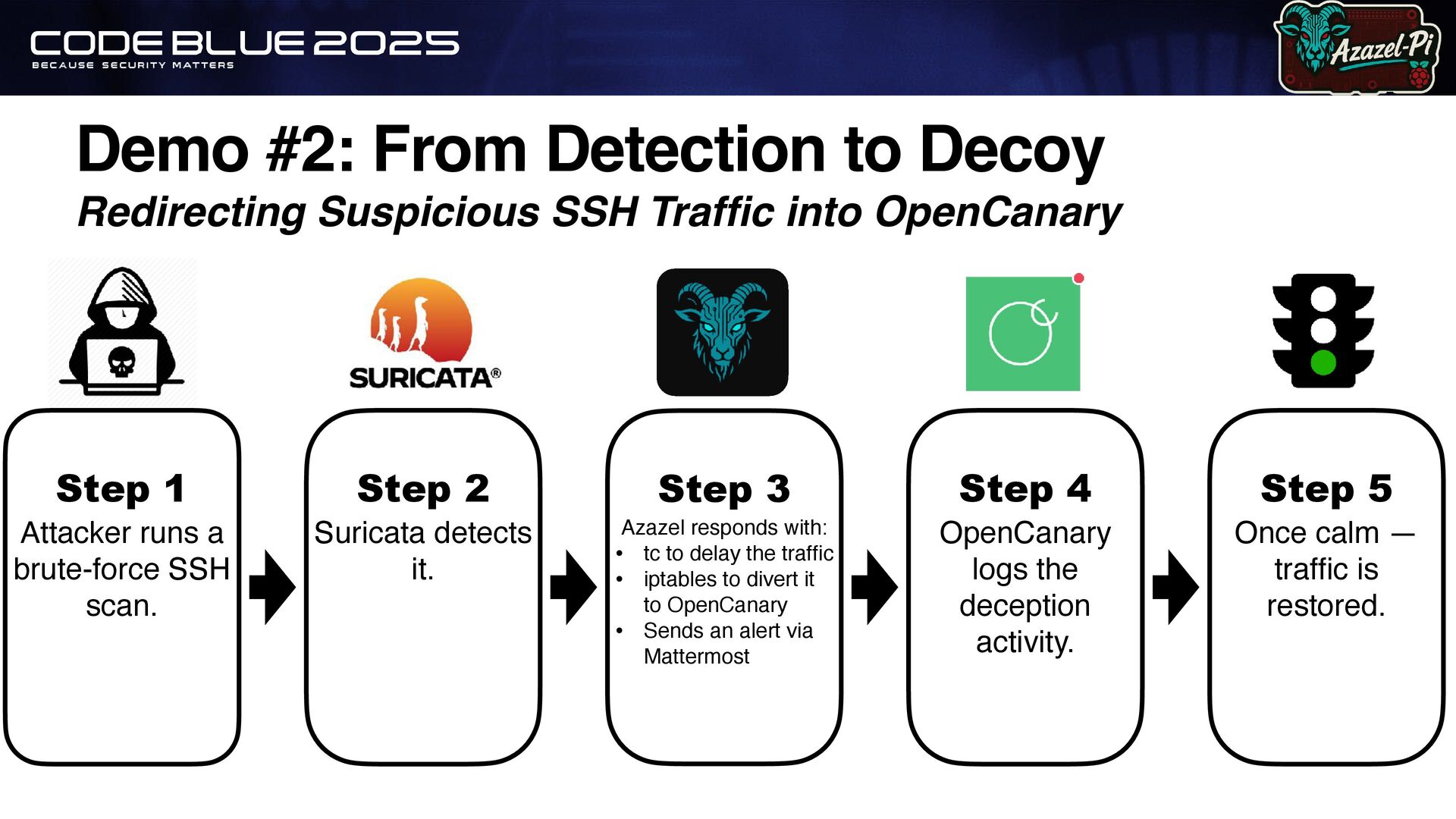 The Azazel-Pi architecture combines Suricata IDS/IPS, OpenCanary decoys, and traffic control via tc/nftables with mode switching (Portal/Shield/Lockdown), plus operations and visibility through azctl, a log pipeline, and Mattermost alerts, with threat scoring evolving from rules/heuristics (Mock LLM) toward local LLM integration (Ollama). In the demo, the system reaches readiness in ~90 seconds at ~13W, and demonstrates a full flow where Suricata detects a brute-force SSH scan, Azazel delays the traffic, diverts it to OpenCanary via iptables, alerts via Mattermost, and restores normal routing once calm; the roadmap further includes Safe Portal (QR-based access), role triage, QoS policy evolution, staged deployments, and defense-only legal/ethical guardrails.