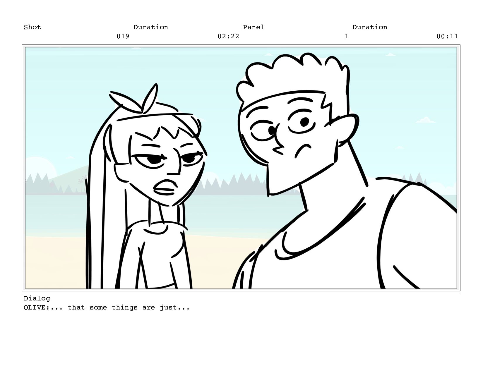 Shot 019 Duration 02:22 Panel 1 Duration 00:11 Dialog OLIVE:...