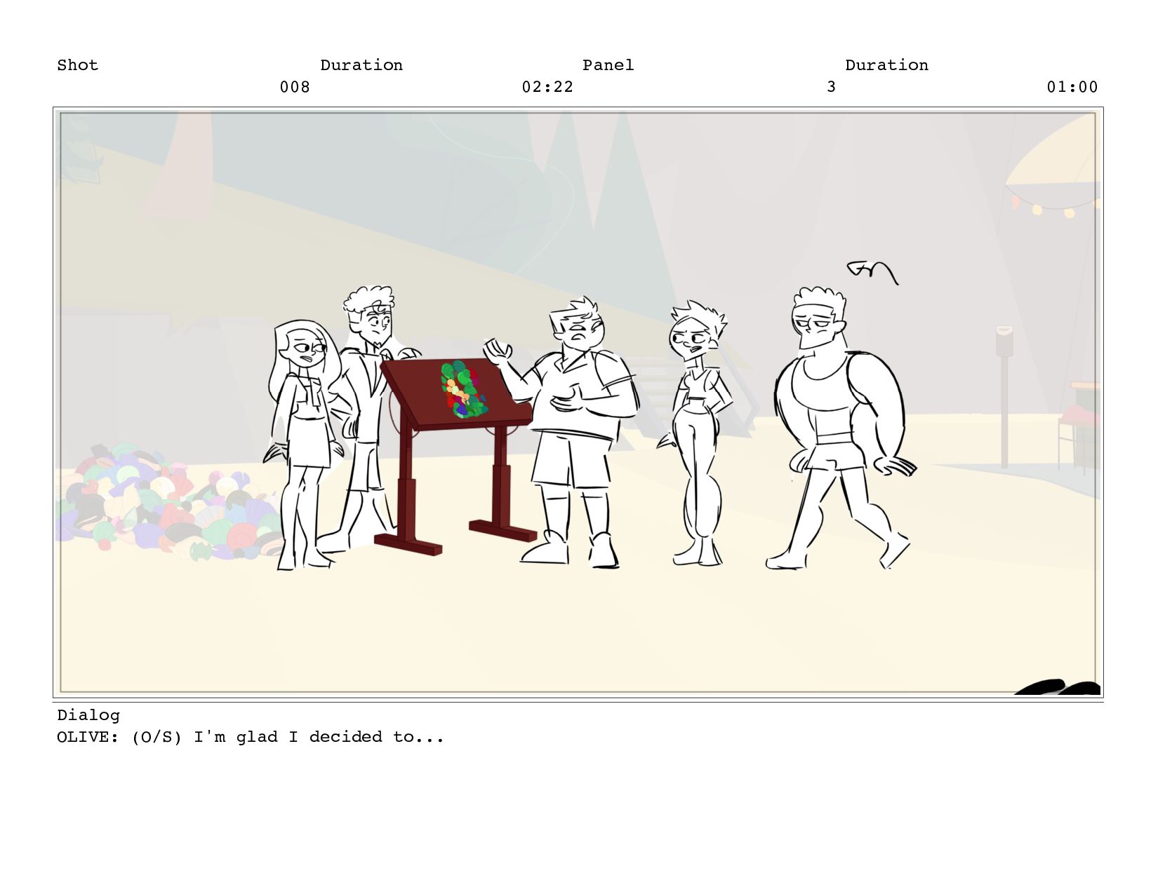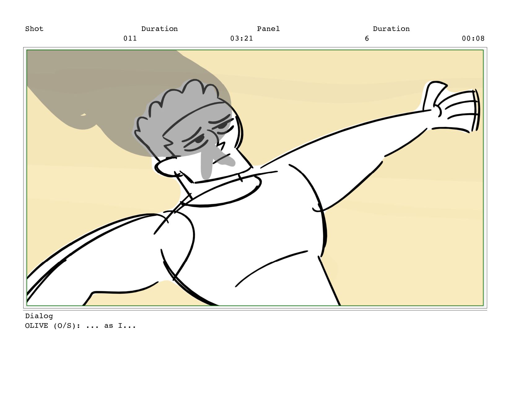 Shot 011 Duration 03:21 Panel 6 Duration 00:08 Dialog OLIVE