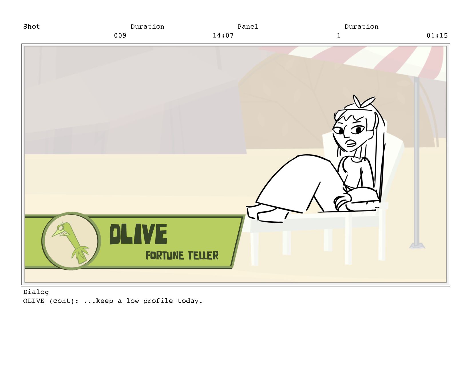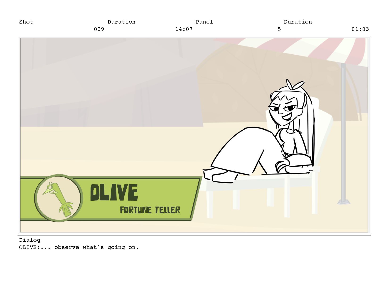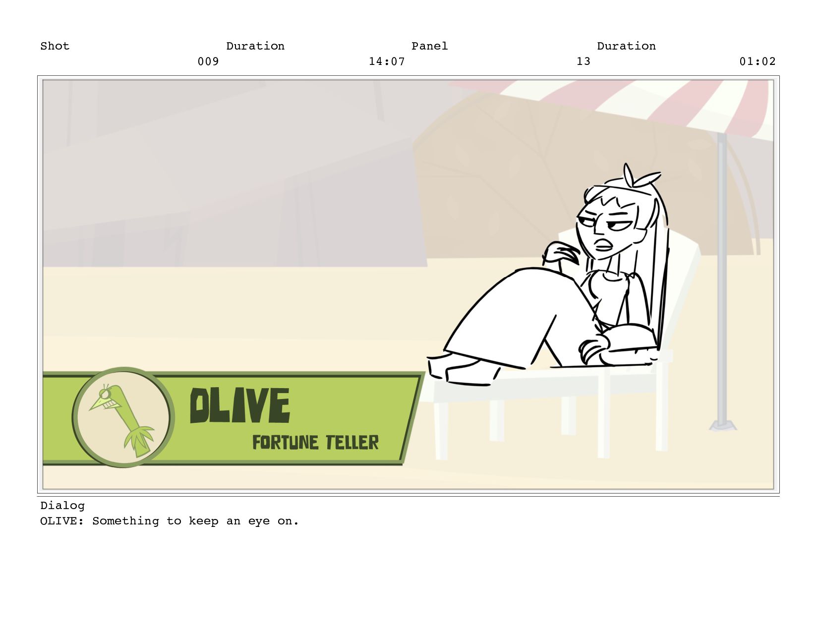 Shot 009 Duration 14:07 Panel 14 Duration 01:00 Dialog OLIVE: