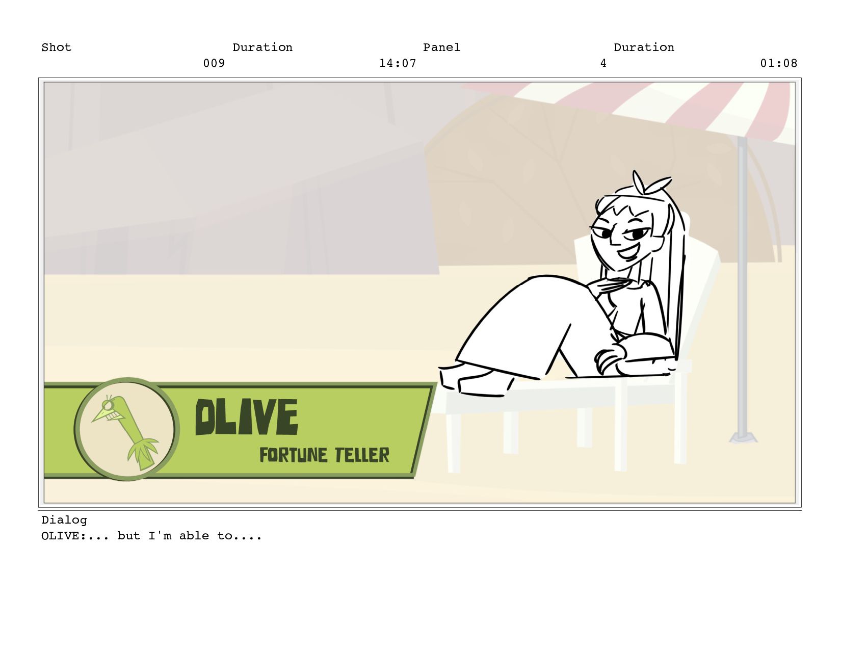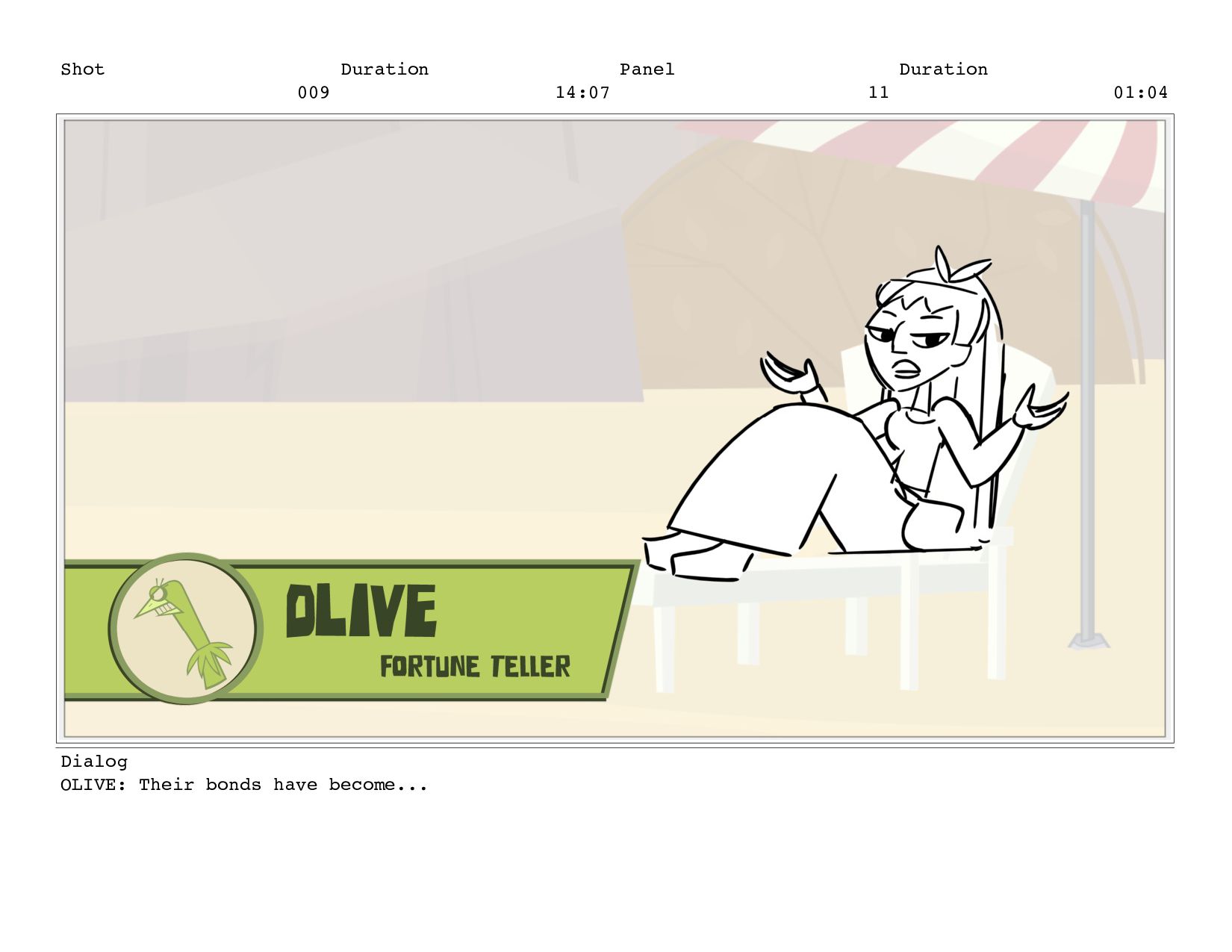 Shot 009 Duration 14:07 Panel 11 Duration 01:04 Dialog OLIVE: