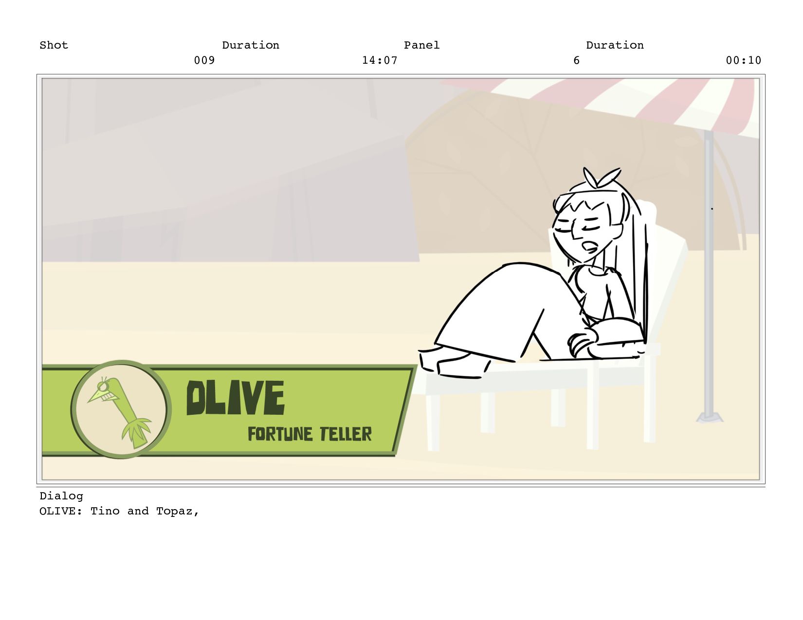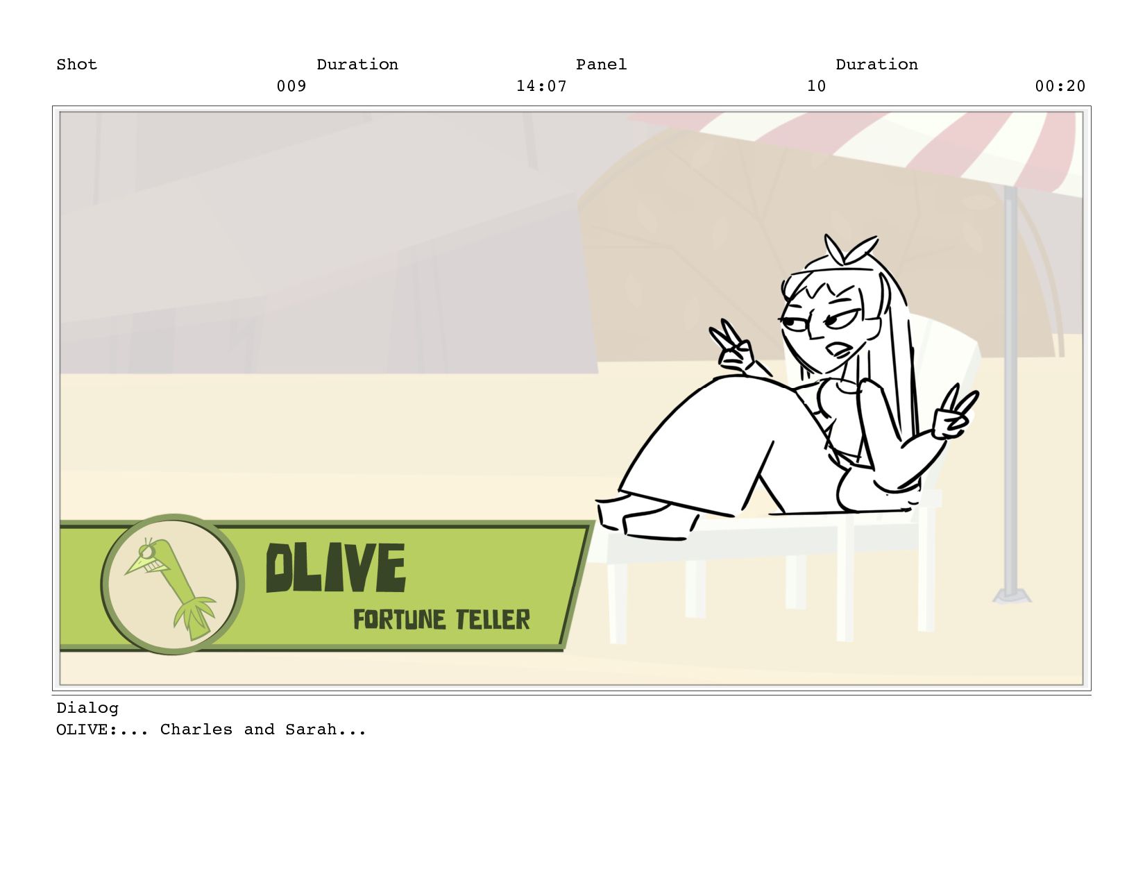 Shot 009 Duration 14:07 Panel 10 Duration 00:20 Dialog OLIVE:...
