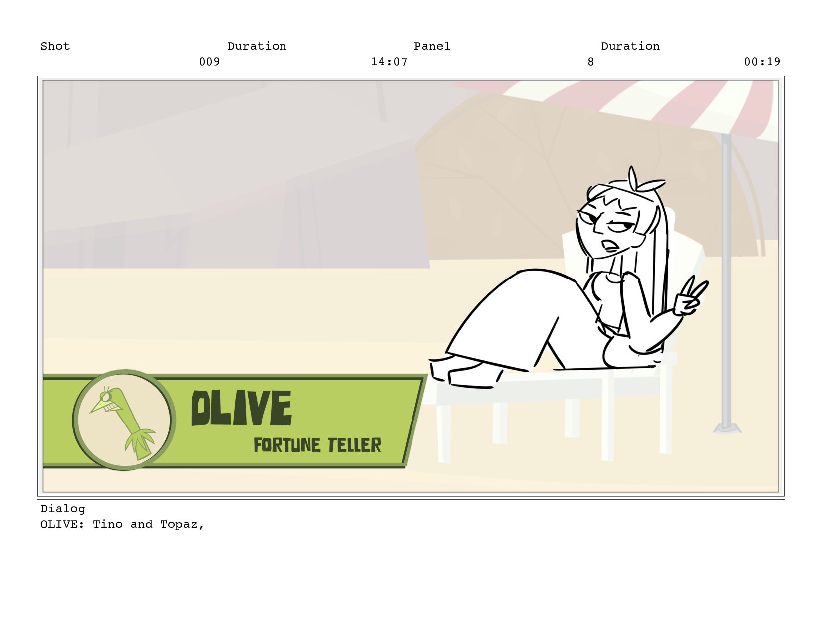 Shot 009 Duration 14:07 Panel 8 Duration 00:19 Dialog OLIVE: