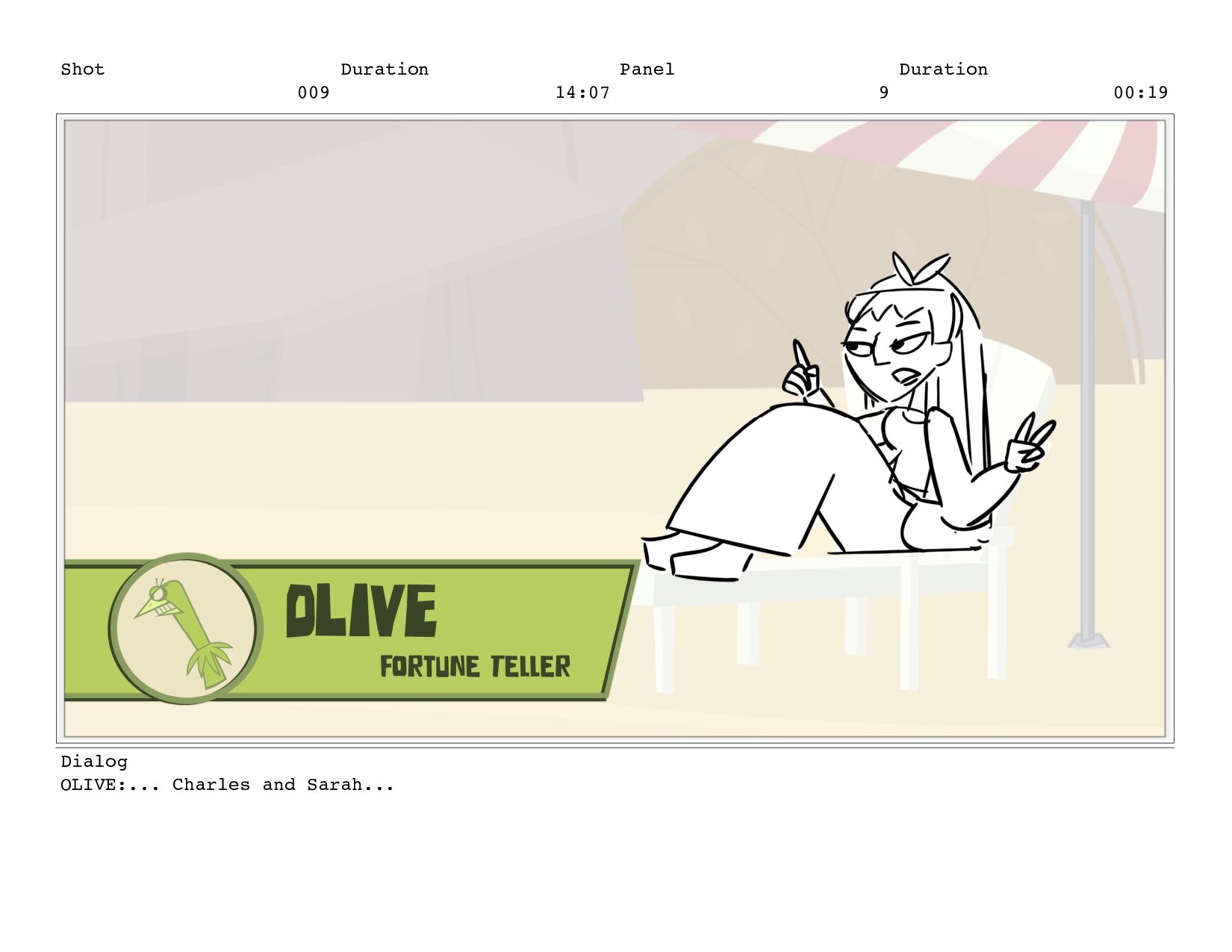 Shot 009 Duration 14:07 Panel 9 Duration 00:19 Dialog OLIVE:...