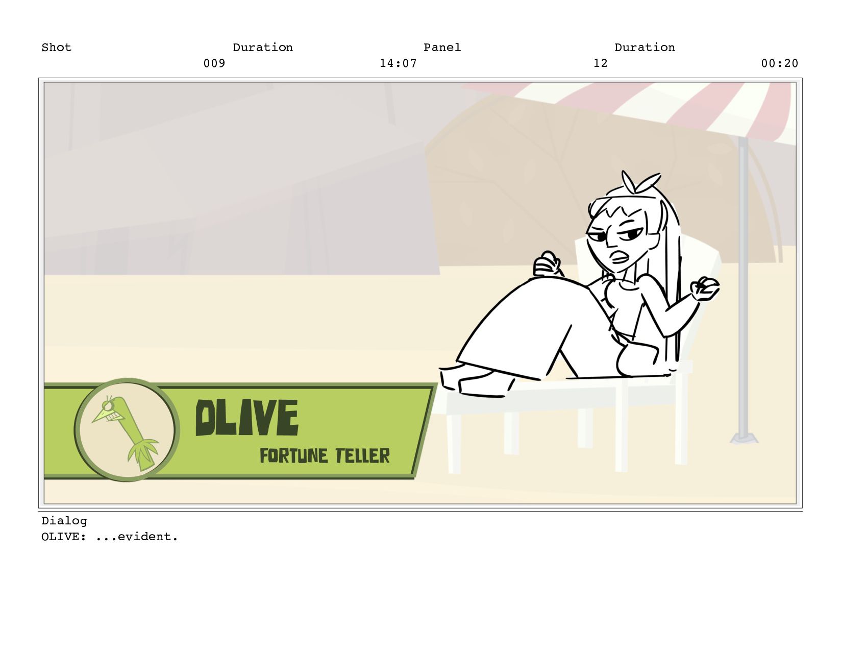 Shot 009 Duration 14:07 Panel 12 Duration 00:20 Dialog OLIVE:
