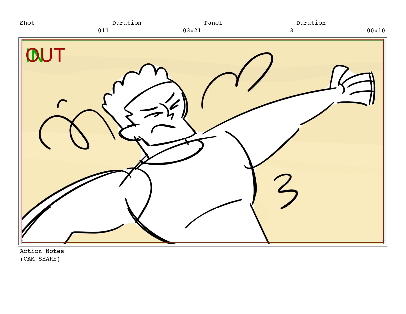 Shot 011 Duration 03:21 Panel 3 Duration 00:10 Action Notes