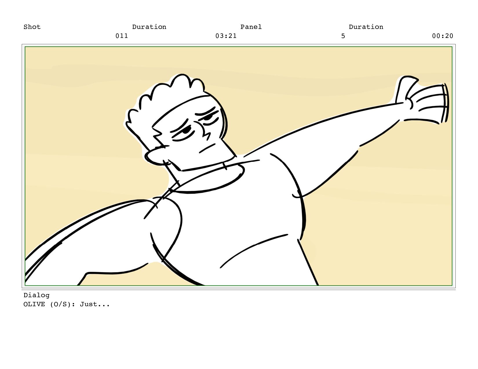 Shot 011 Duration 03:21 Panel 5 Duration 00:20 Dialog OLIVE