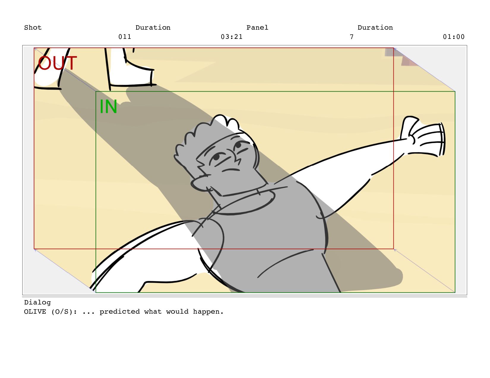 Shot 011 Duration 03:21 Panel 7 Duration 01:00 Dialog OLIVE