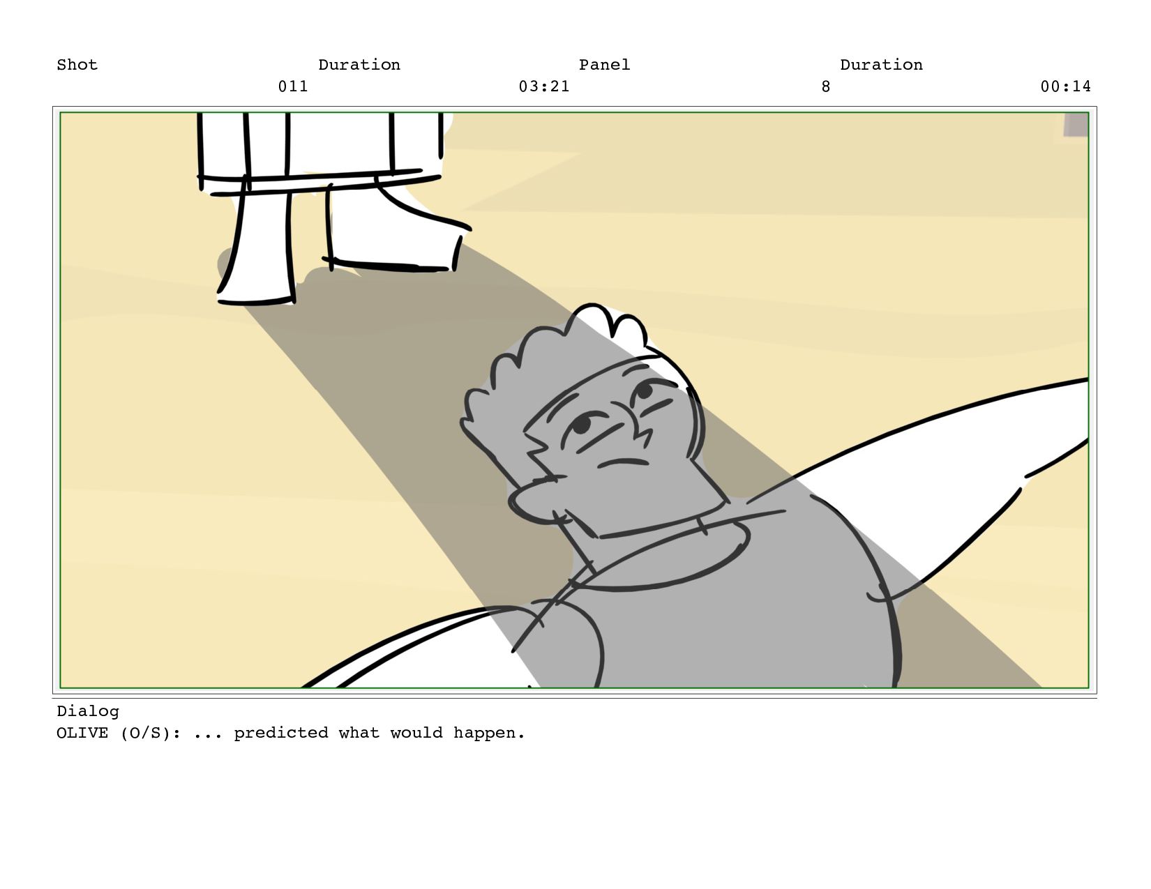 Shot 011 Duration 03:21 Panel 8 Duration 00:14 Dialog OLIVE