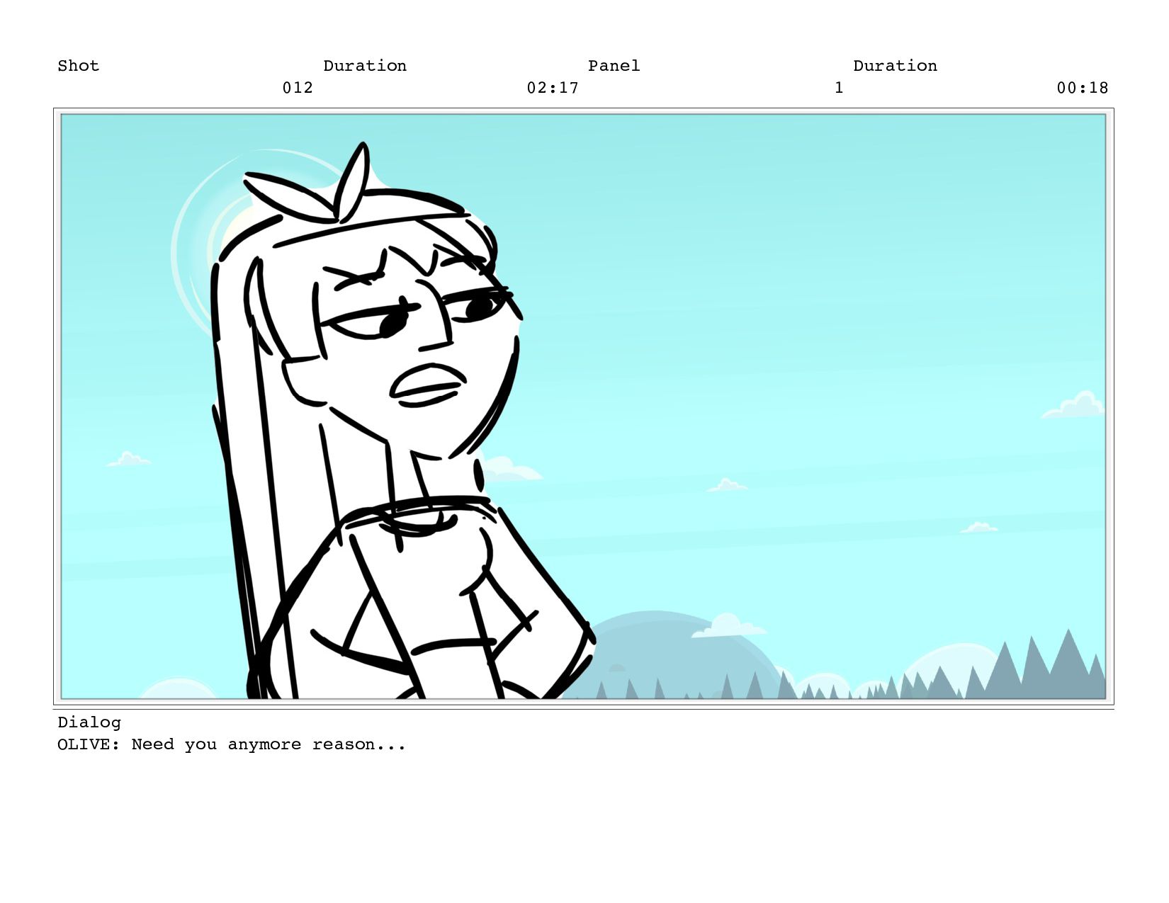 Shot 012 Duration 02:17 Panel 1 Duration 00:18 Dialog OLIVE: