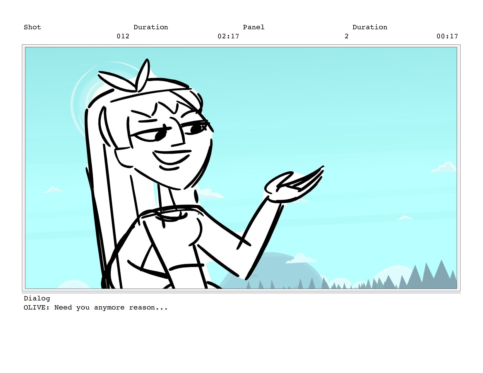 Shot 012 Duration 02:17 Panel 2 Duration 00:17 Dialog OLIVE: