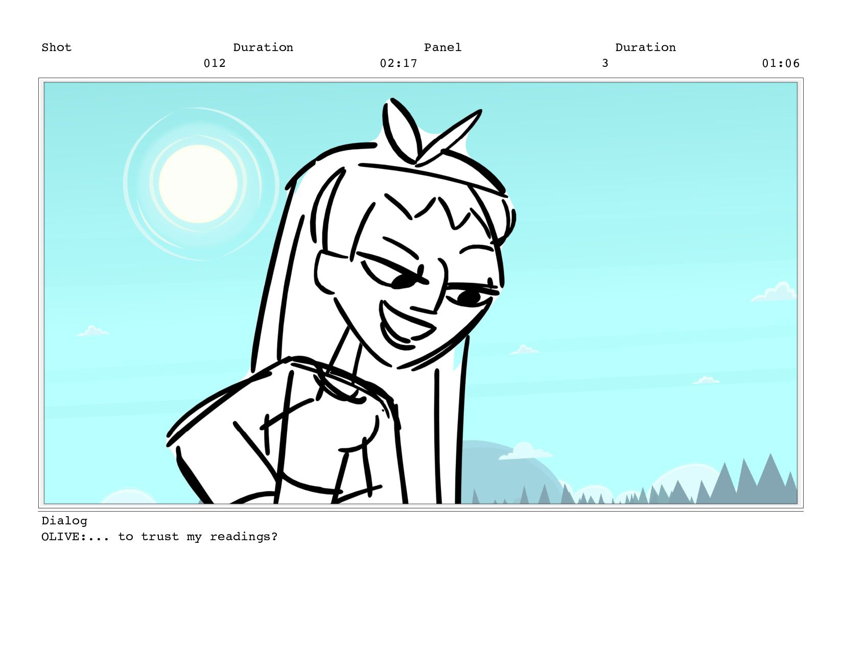 Shot 012 Duration 02:17 Panel 3 Duration 01:06 Dialog OLIVE:...