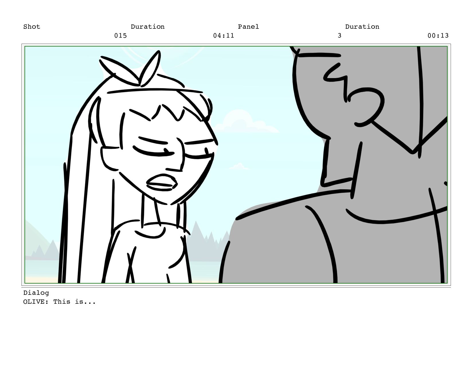 Shot 015 Duration 04:11 Panel 3 Duration 00:13 Dialog OLIVE: