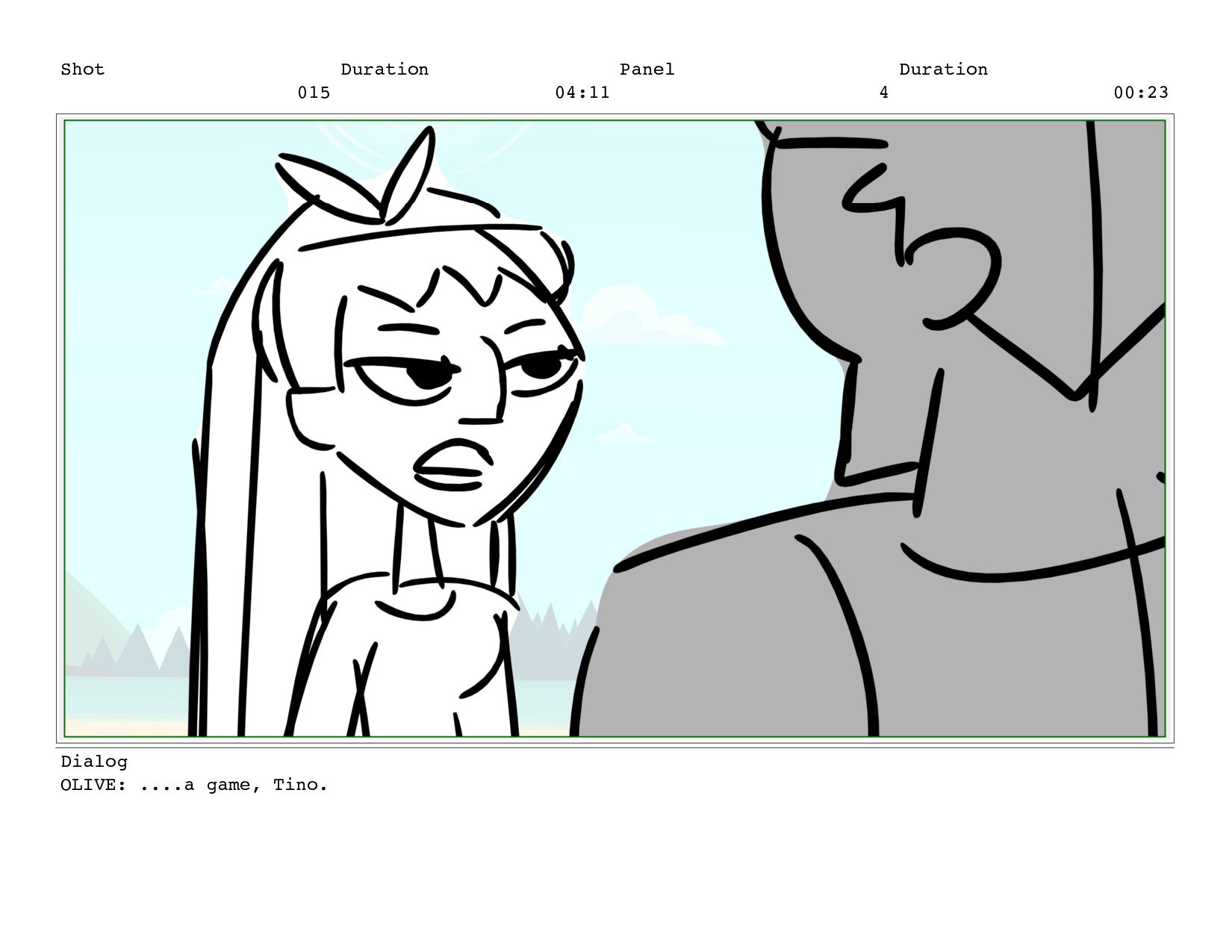 Shot 015 Duration 04:11 Panel 4 Duration 00:23 Dialog OLIVE: