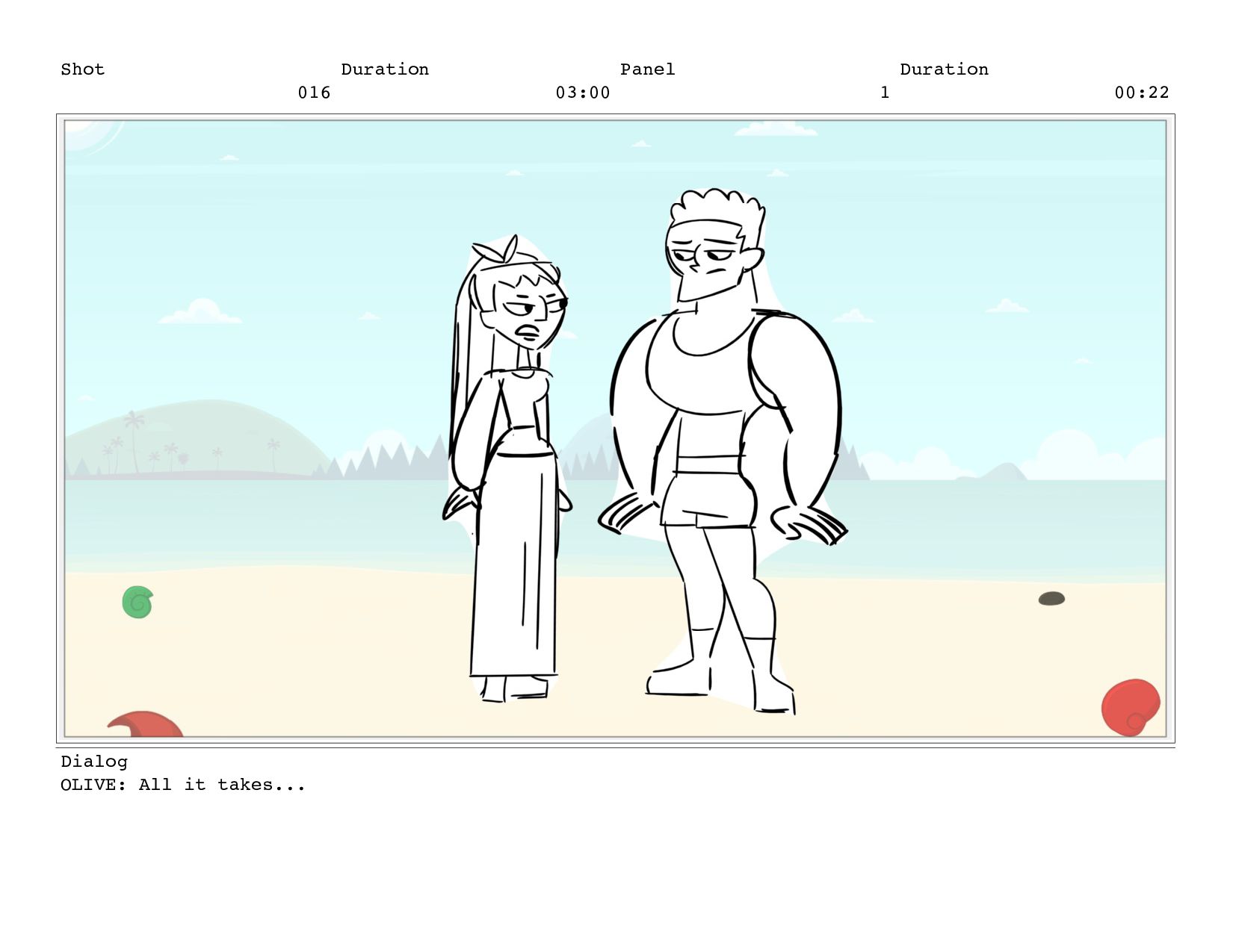 Shot 016 Duration 03:00 Panel 1 Duration 00:22 Dialog OLIVE: