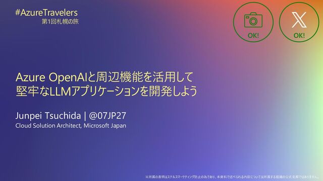 1. Azure OpenAIと周辺機能を活用して 堅牢なLLMアプリケーションを開発しよう Junpei Tsuchida | @07JP27 Cloud Solution Architect,