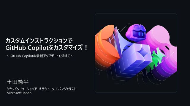 〜GitHub Copilotの最新アップデートを添えて〜 カスタムインストラクションで GitHub Copilotをカスタマイズ! 土田純平 クラウドソリューションアーキテクト & エバンジェリスト Microsoft