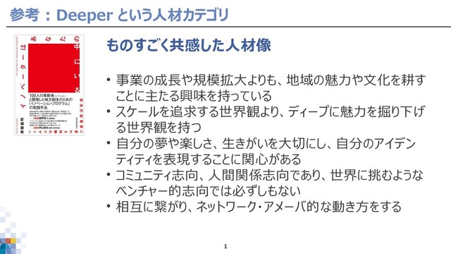 『イノベーターはあなたの中にいる』 (https://str.toyokeizai.net/books/9784492212455/) にて知った、Deeperという人材カテゴリに共感。チーム等で話をする際に使うスライドを作ったので登録しておきます。