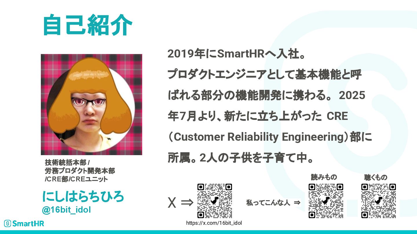 1. 自己紹介 2019年にSmartHRへ入社。 プロダクトエンジニアとして基本機能と呼 ばれる部分の機能開発に携わる。 2025 年7月より、新たに立ち上がった CRE (Customer Reliability Engineering)部に