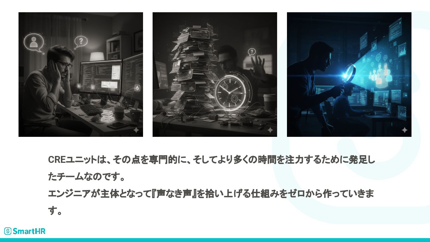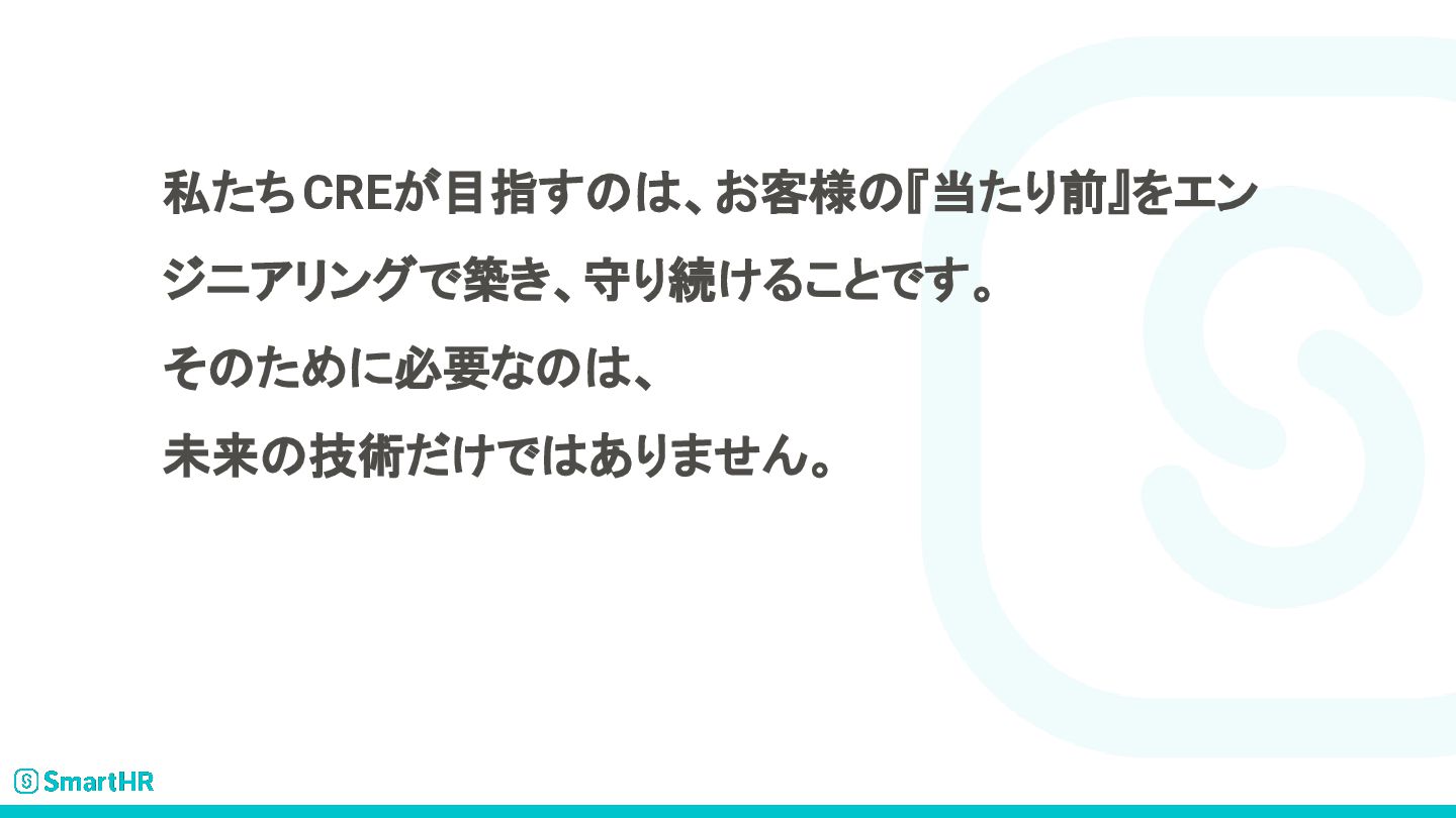 本資料では、その課題に対する一つの答えとして、SmartHRで新たに立ち上がった「CRE(Customer Reliability Engineering)」ユニットの挑戦を紹介します。