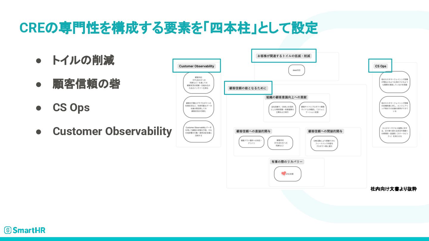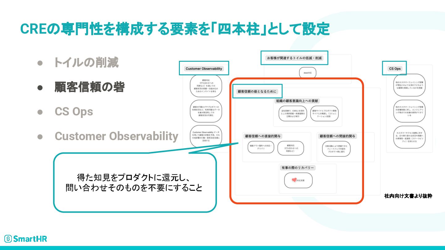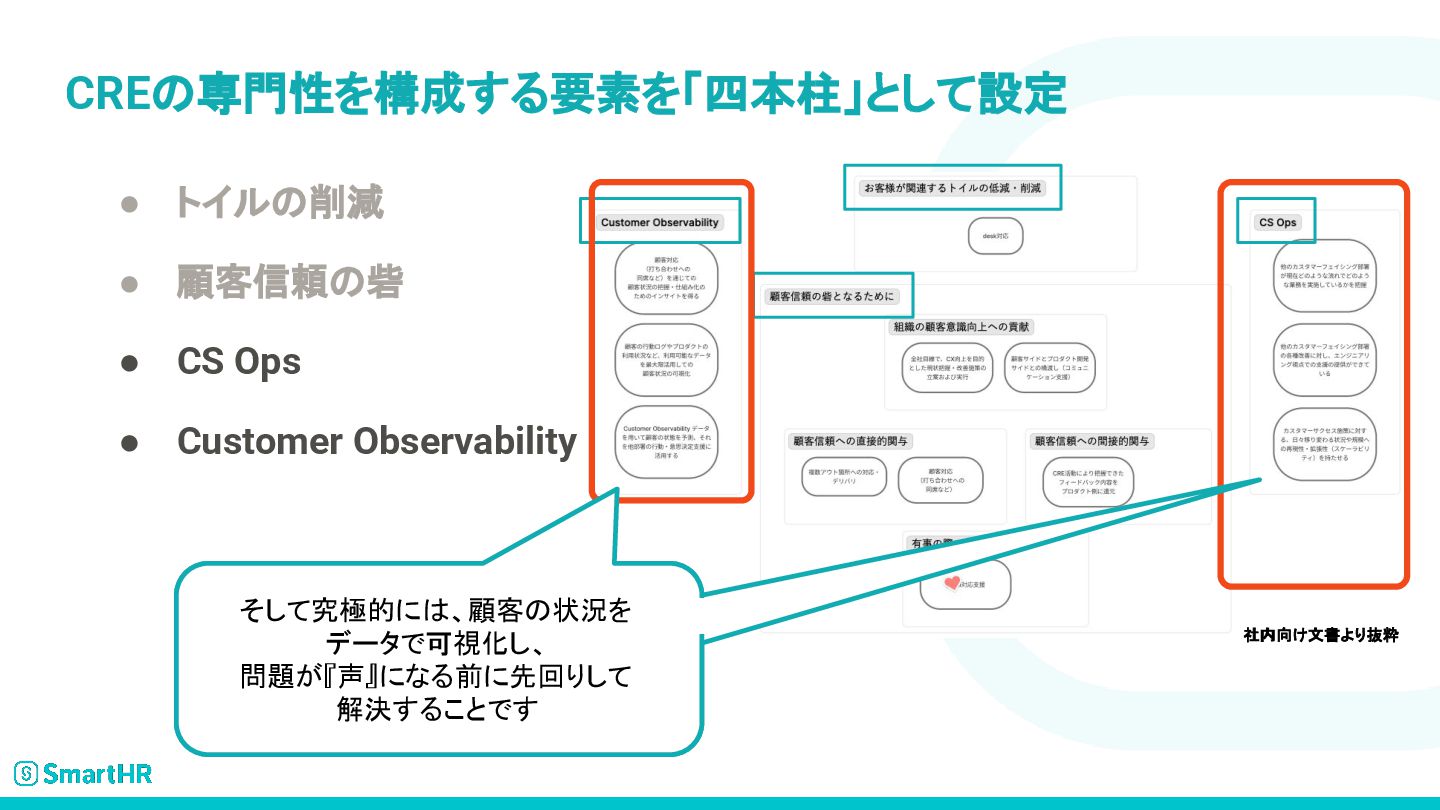 CREの専門性を構成する要素を「四本柱」として設定 社内向け文書より抜粋 そして究極的には、顧客の状況を データで可視化し、 問題が『声』になる前に先回りして 解決することです