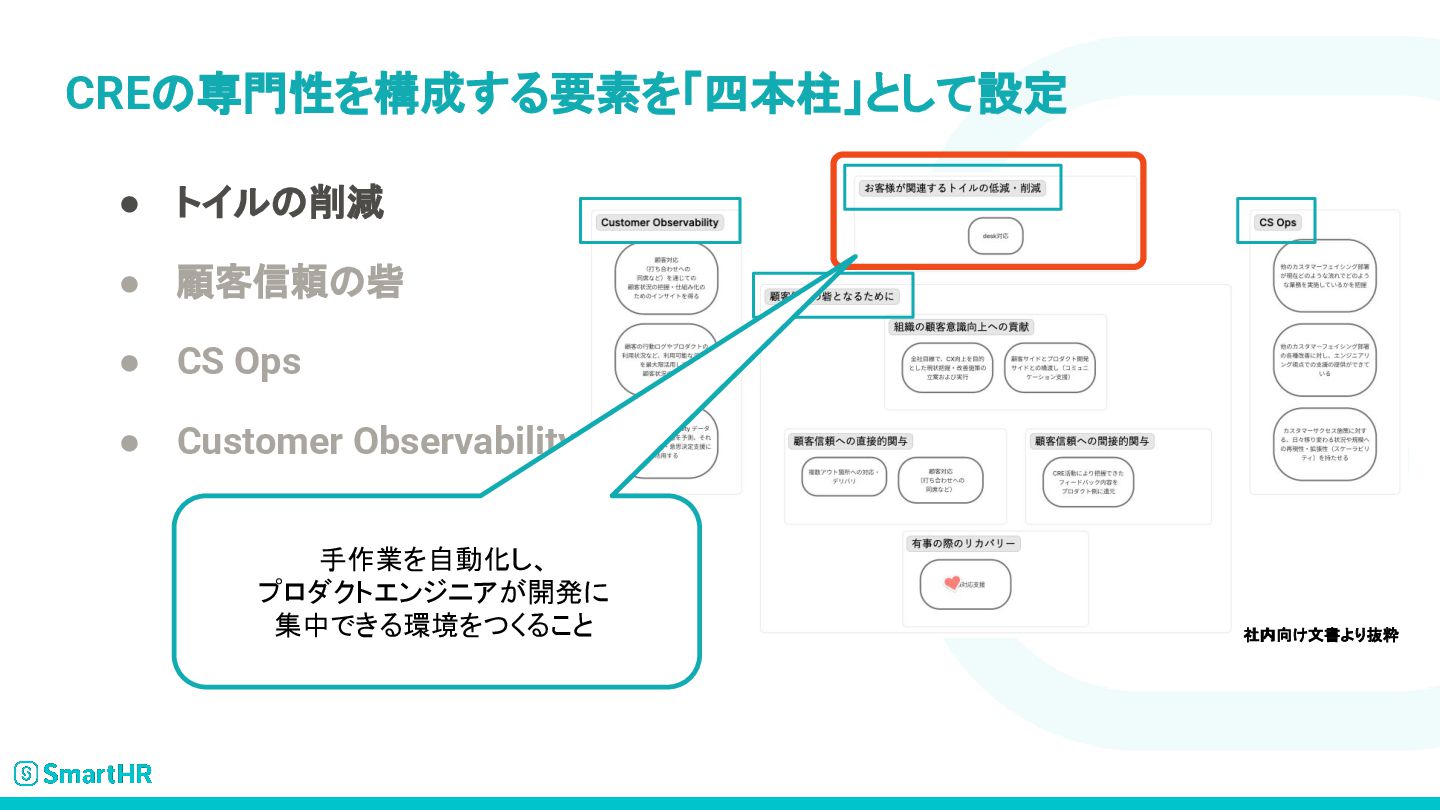 CREの専門性を構成する要素を「四本柱」として設定 社内向け文書より抜粋 手作業を自動化し、 プロダクトエンジニアが開発に 集中できる環境をつくること