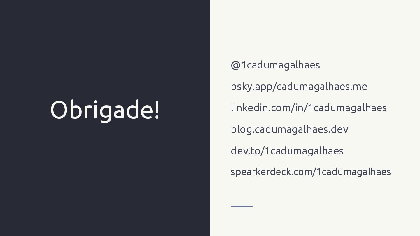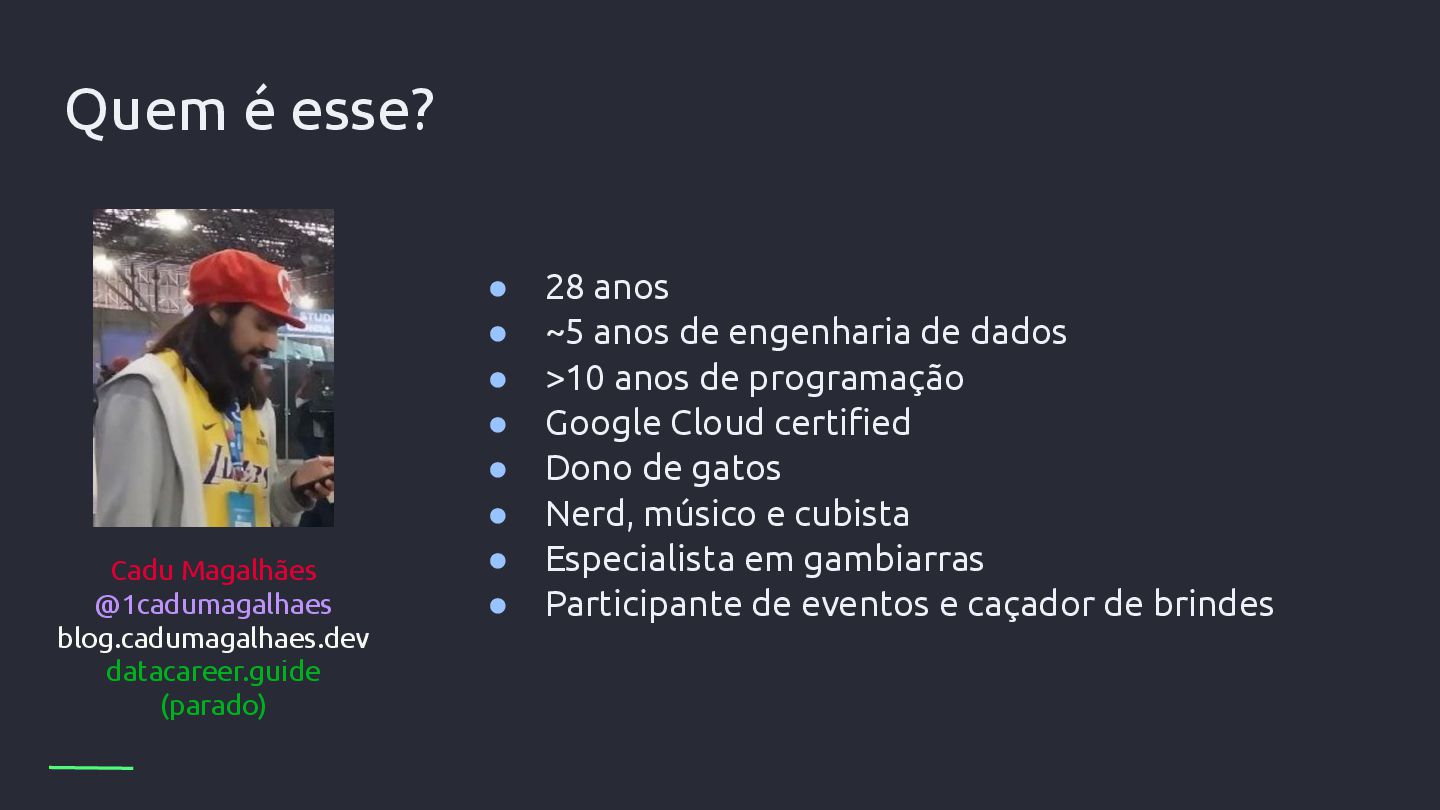 engenharia de dados • >10 anos de programação • Google Cloud certified • Dono de gatos • Nerd, músico e cubista • Especialista em gambiarras • Participante de eventos e caçador de brindes Cadu Magalhães @1cadumagalhaes blog.cadumagalhaes.dev datacareer.guide (parado)