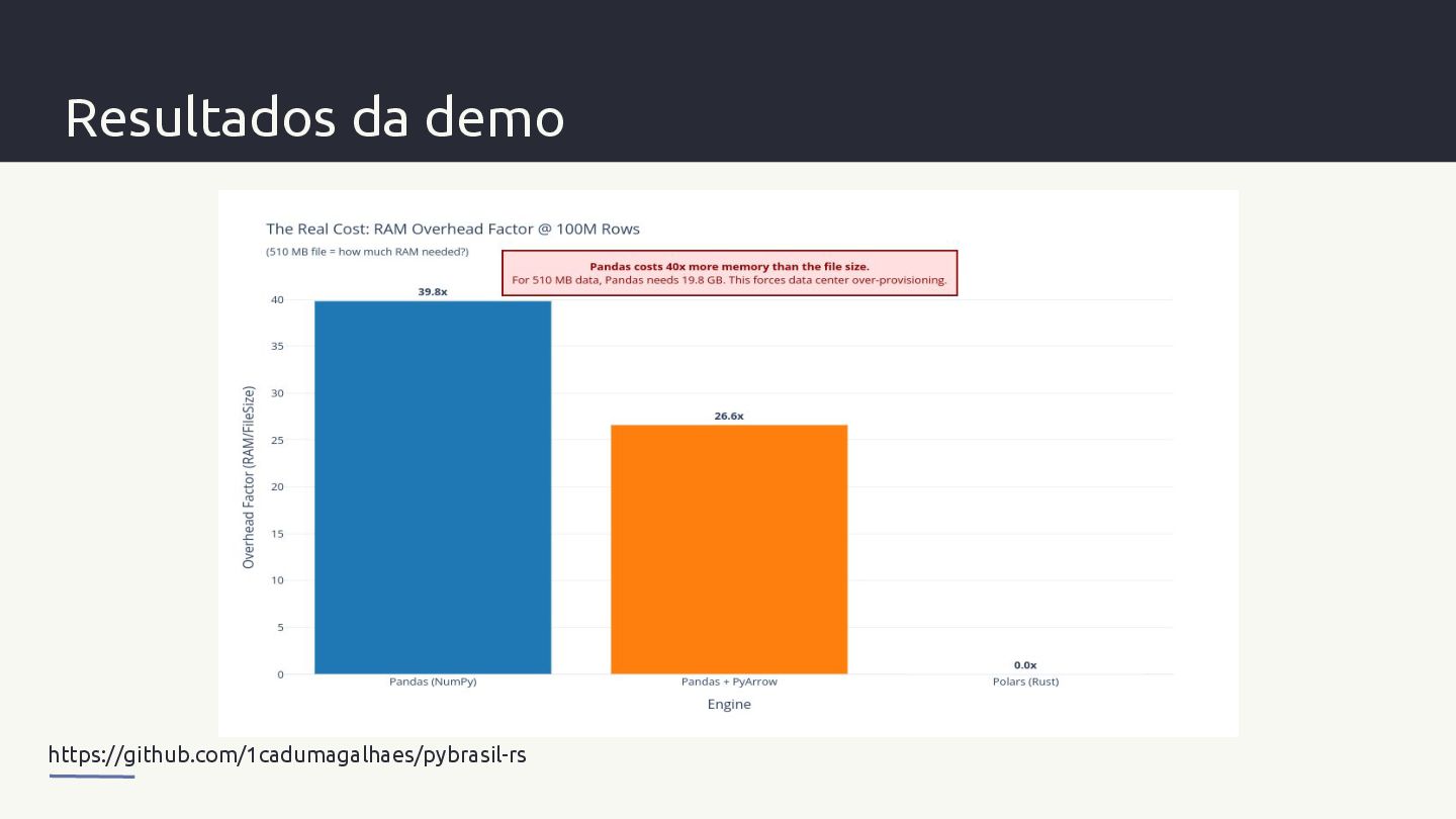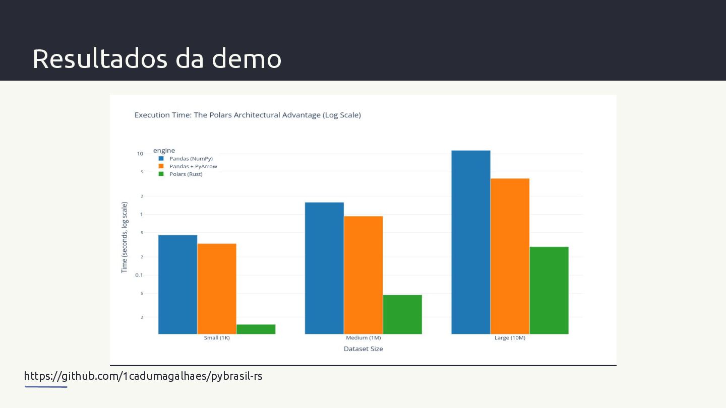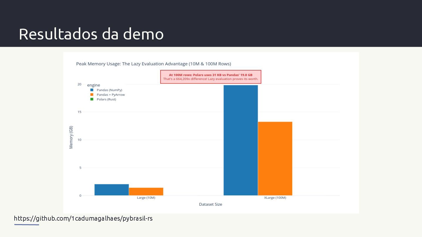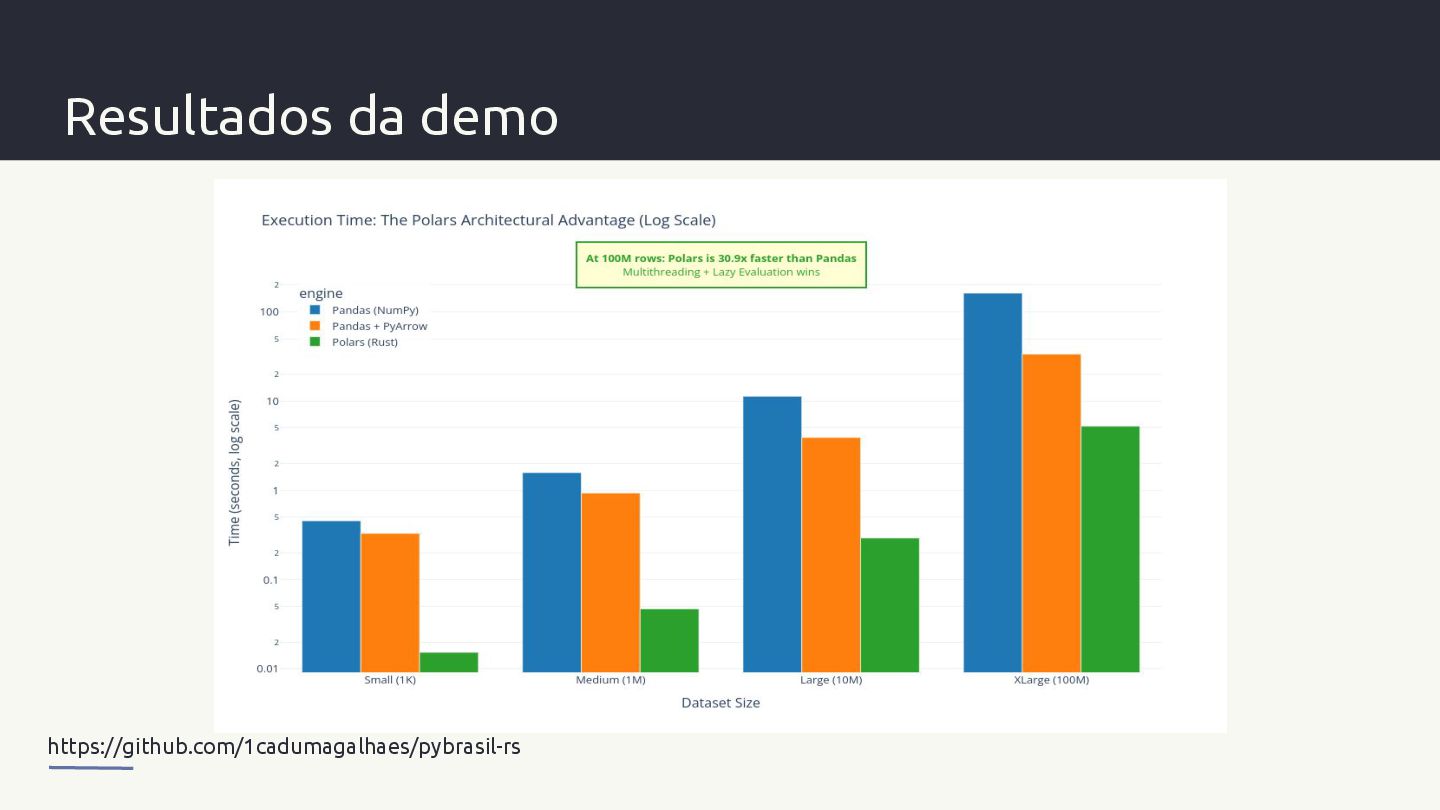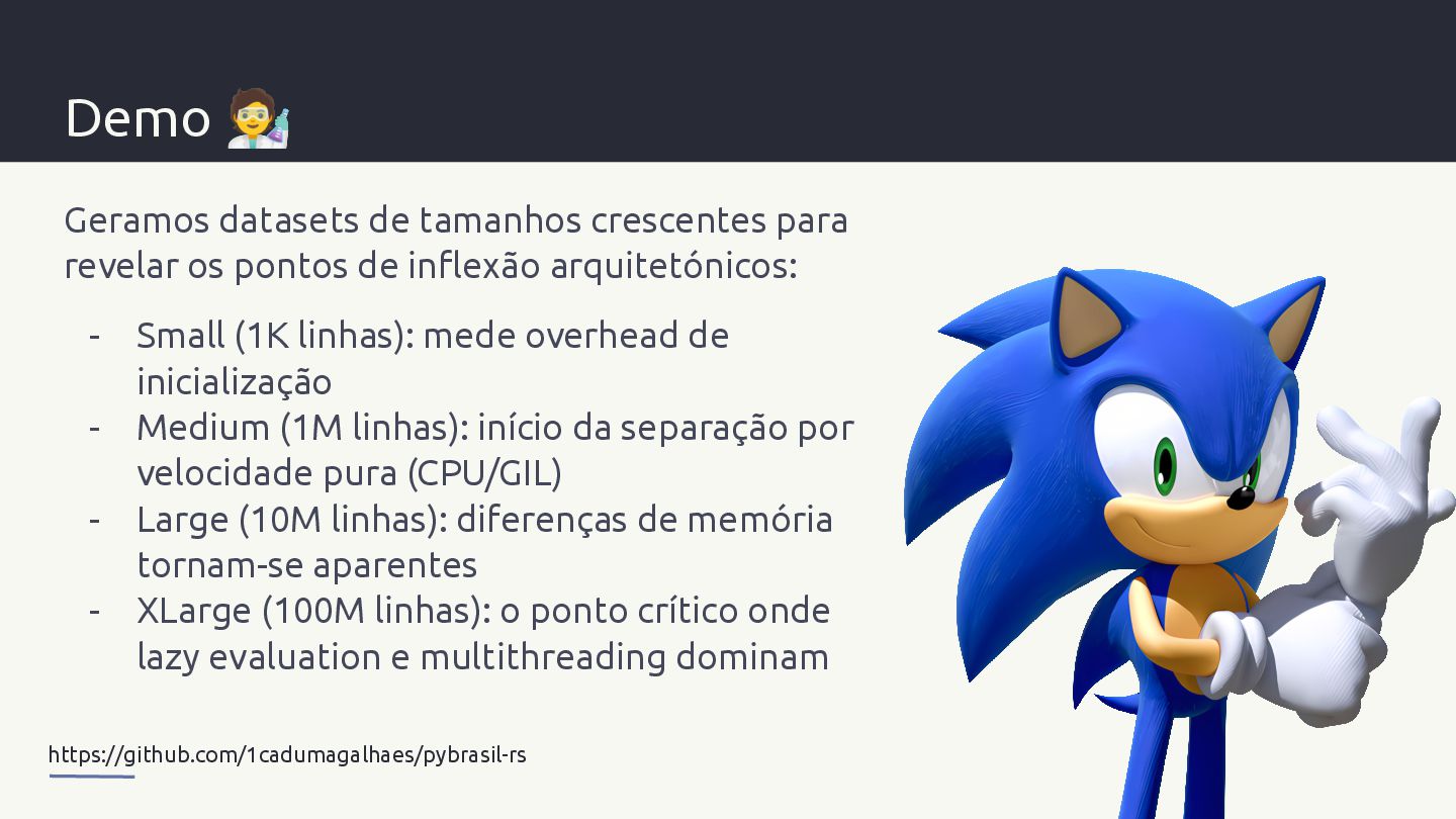 pontos de inflexão arquitetónicos: - Small (1K linhas): mede overhead de inicialização - Medium (1M linhas): início da separação por velocidade pura (CPU/GIL) - Large (10M linhas): diferenças de memória tornam-se aparentes - XLarge (100M linhas): o ponto crítico onde lazy evaluation e multithreading dominam https://github.com/1cadumagalhaes/pybrasil-rs