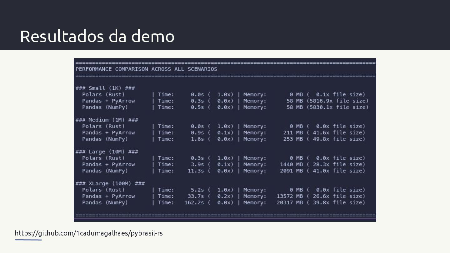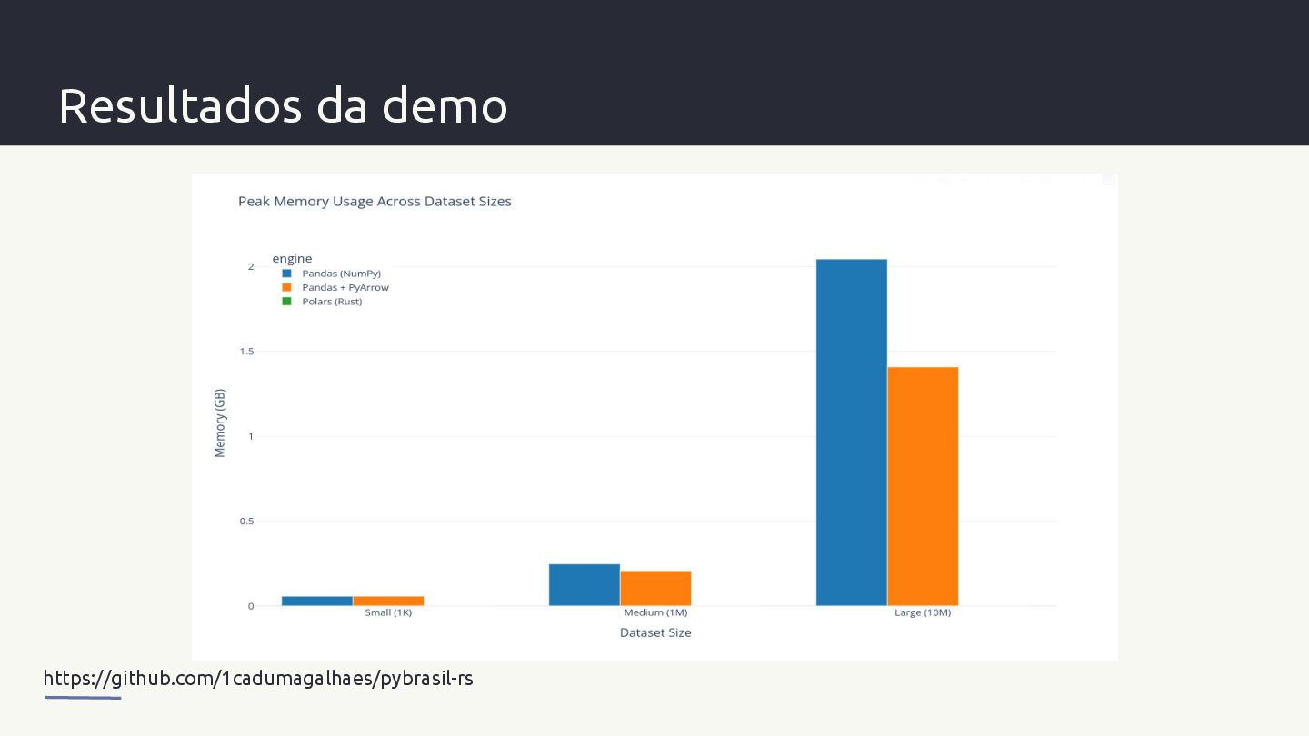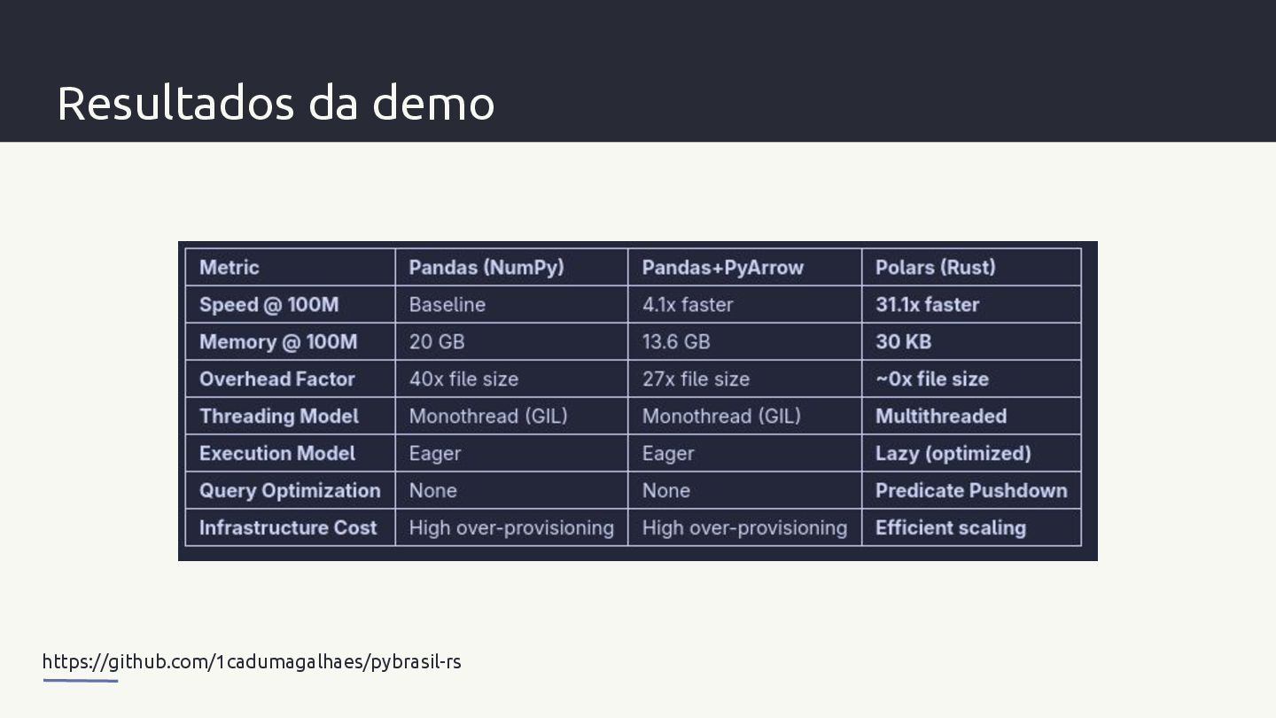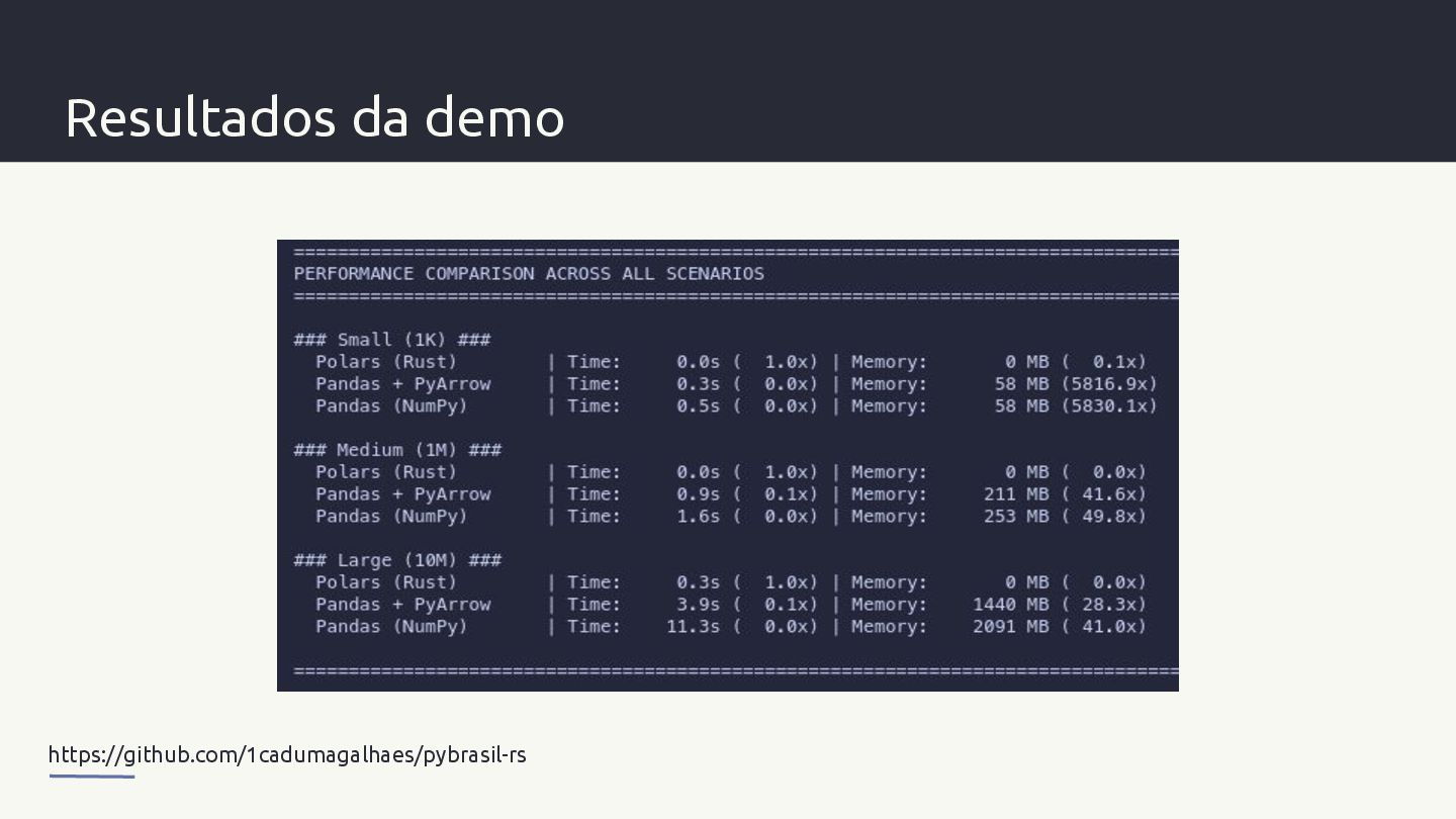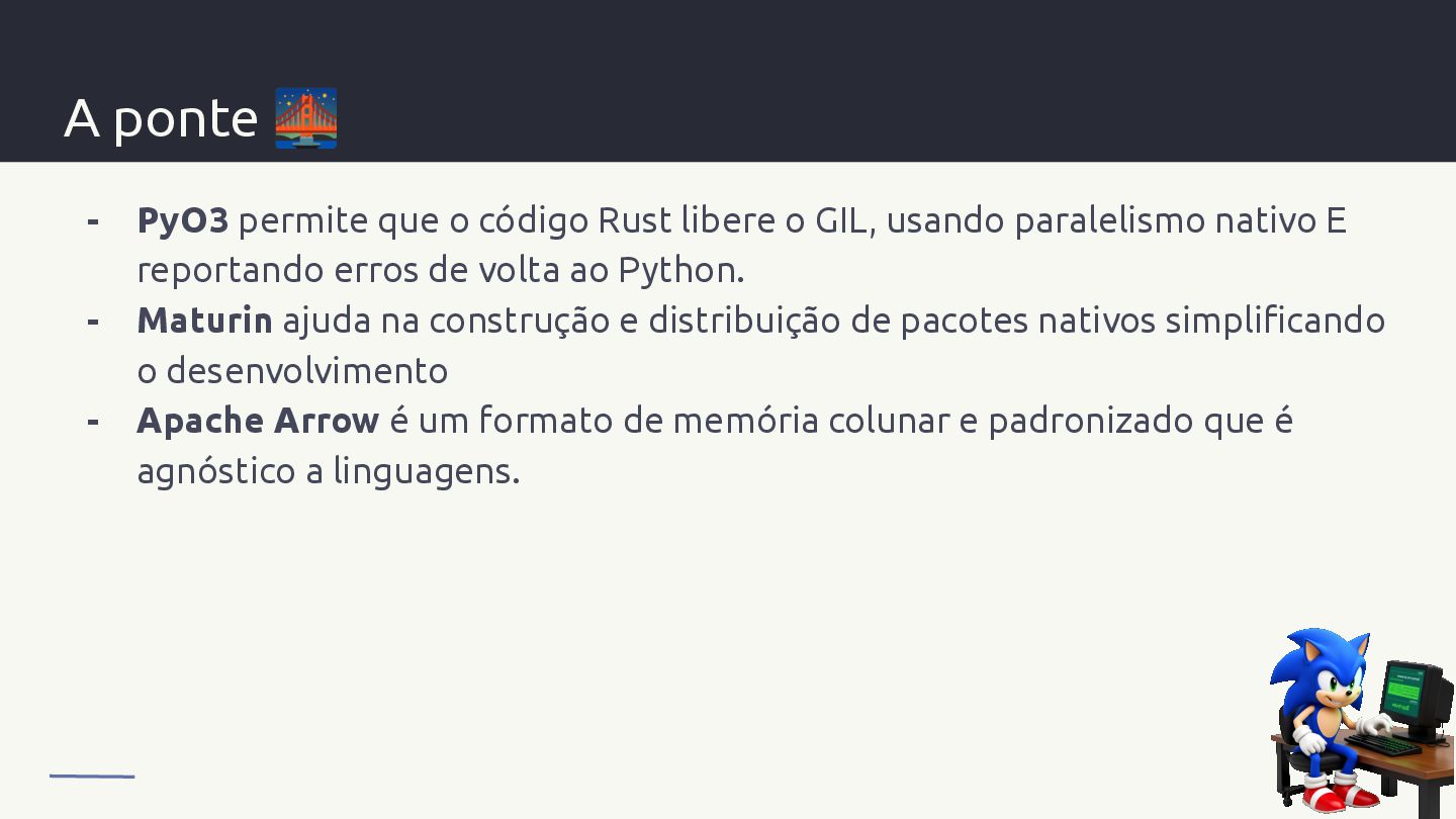 libere o GIL, usando paralelismo nativo E reportando erros de volta ao Python. - Maturin ajuda na construção e distribuição de pacotes nativos simplificando o desenvolvimento - Apache Arrow é um formato de memória colunar e padronizado que é agnóstico a linguagens.