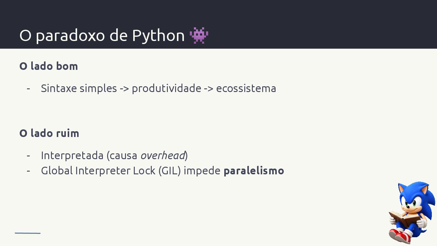 simples -> produtividade -> ecossistema O lado ruim - Interpretada (causa overhead) - Global Interpreter Lock (GIL) impede paralelismo