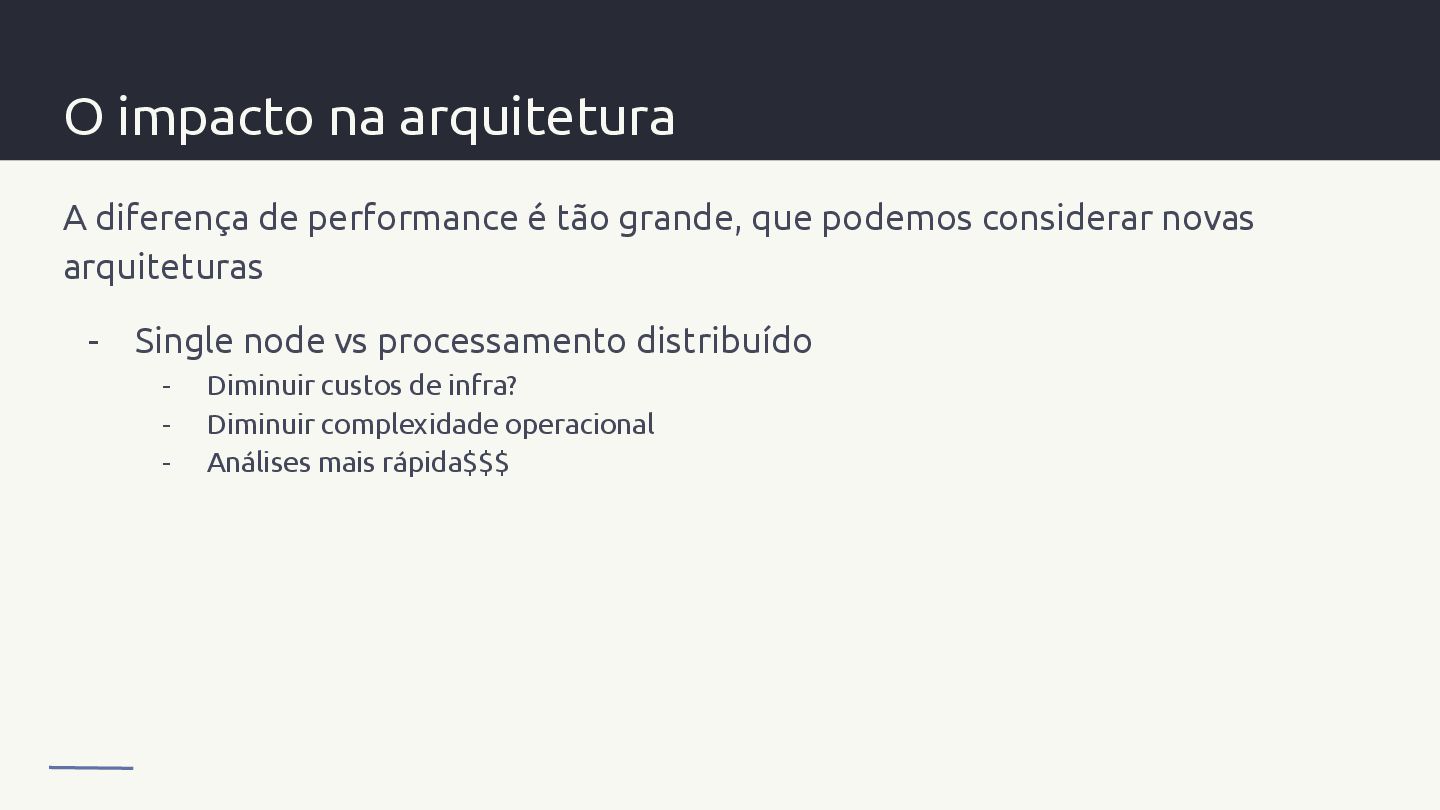 grande, que podemos considerar novas arquiteturas - Single node vs processamento distribuído - Diminuir custos de infra? - Diminuir complexidade operacional - Análises mais rápida$$$