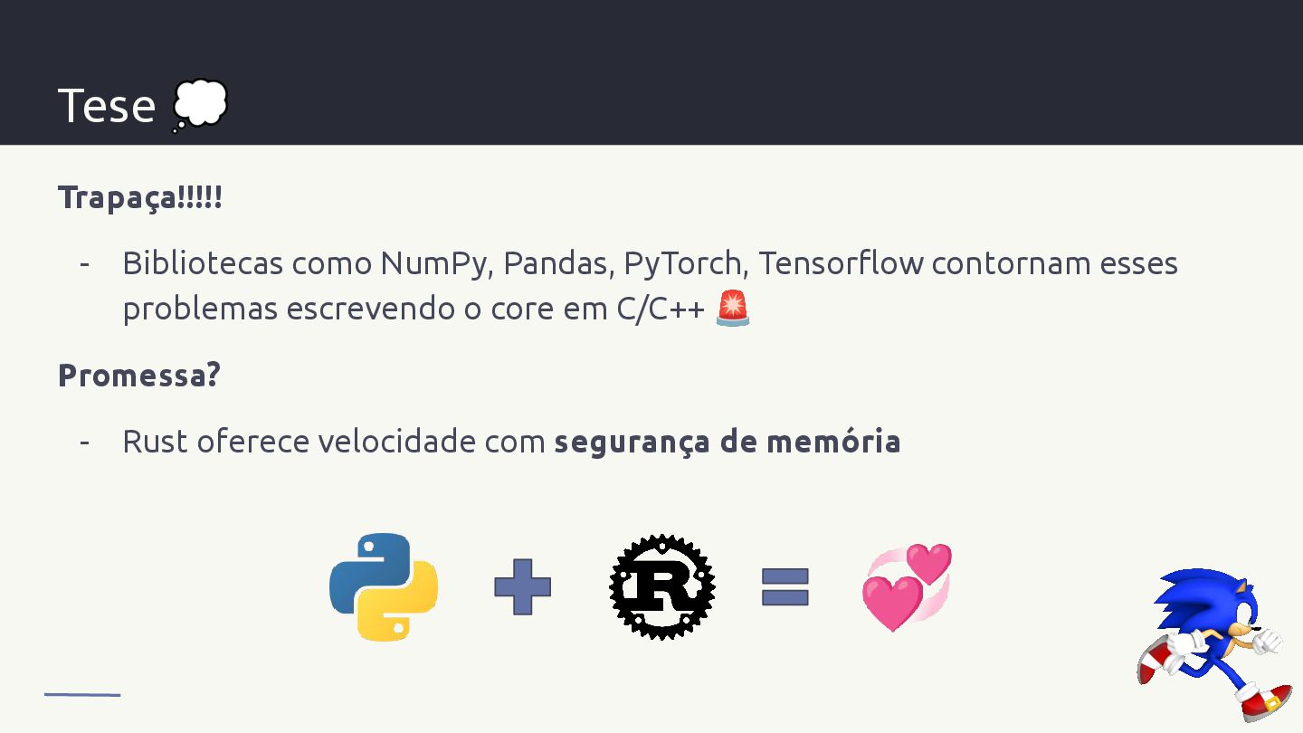 O objetivo é mostrar que, quando muita performance é necessária, rust por baixo dos panos resolve muita coisa - Python como interface, rust trabalhando e todo mundo sai feliz