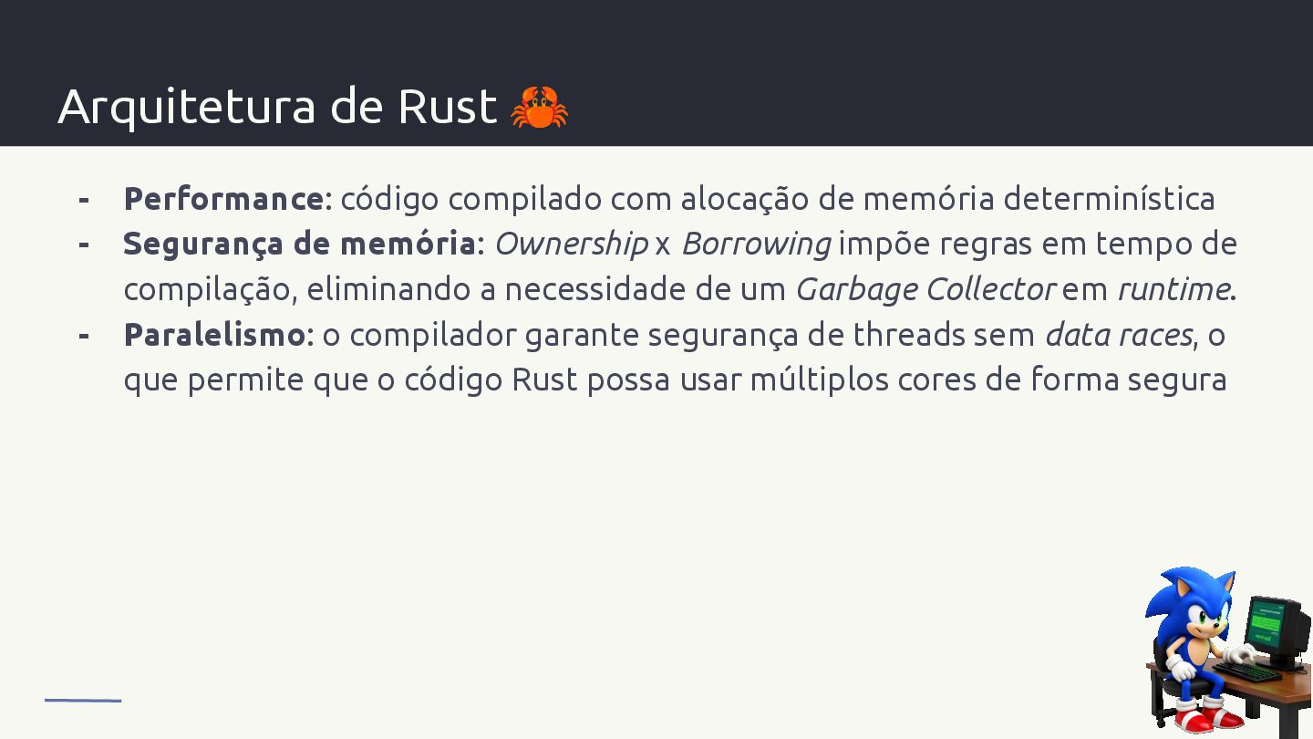 de memória determinística - Segurança de memória: Ownership x Borrowing impõe regras em tempo de compilação, eliminando a necessidade de um Garbage Collector em runtime. - Paralelismo: o compilador garante segurança de threads sem data races, o que permite que o código Rust possa usar múltiplos cores de forma segura