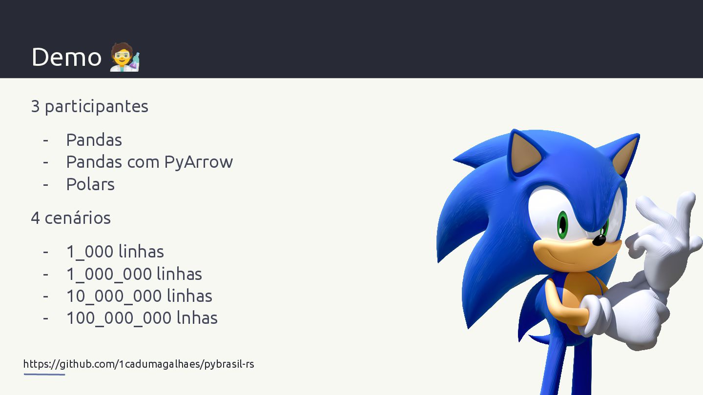 - Polars 4 cenários - 1_000 linhas - 1_000_000 linhas - 10_000_000 linhas - 100_000_000 lnhas https://github.com/1cadumagalhaes/pybrasil-rs
