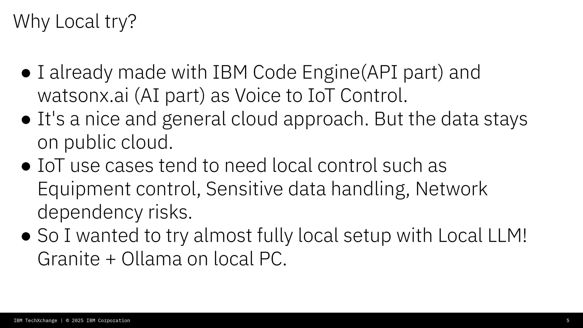 • So I wanted to try almost fully local setup with Local LLM! Granite + Ollama on local PC.