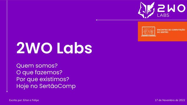 2WO Labs Software House e Consultoria LTDA. Intuito de juntar nossas mentes, mão de obra e projetos. Foco em treinamentos na área de tecnologia, consultoria e desenvolvimento de softwares sob demanda.