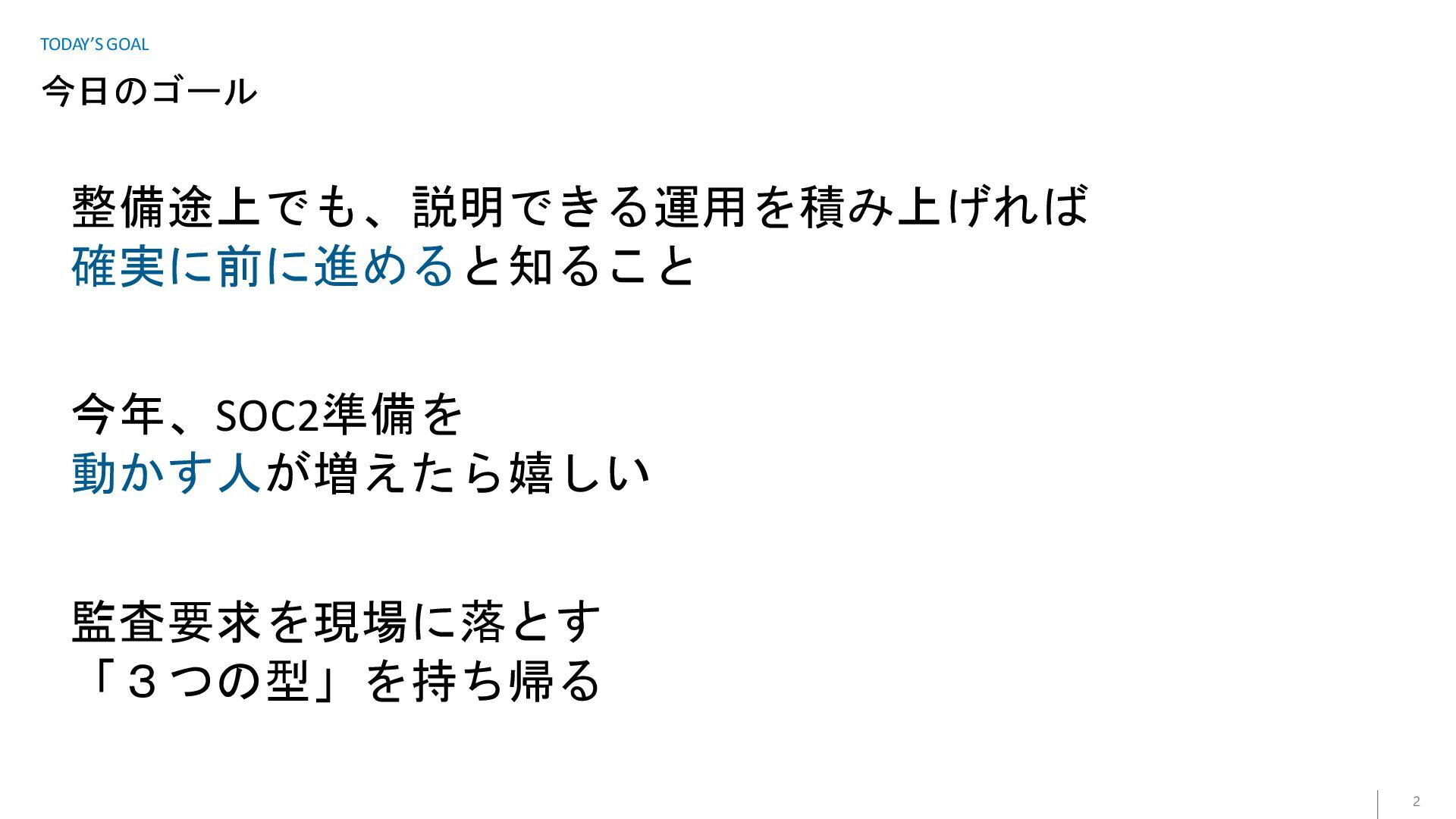 今日のゴール 2 TODAY’S GOAL 整備途上でも、説明できる運用を積み上げれば 確実に前に進めると知ること 今年、SOC2準備を 動かす人が増えたら嬉しい 監査要求を現場に落とす 「3つの型」を持ち帰る