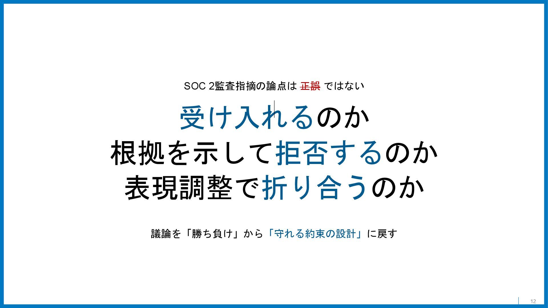 12 受け入れるのか 根拠を示して拒否するのか 表現調整で折り合うのか SOC 2監査指摘の論点は 正誤 ではない 議論を「勝ち負け」から「守れる約束の設計」に戻す