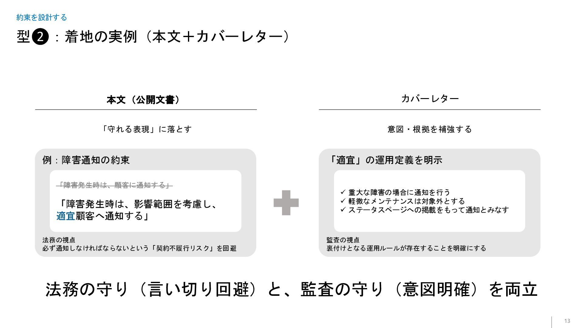 型❷:着地の実例(本文+カバーレター) 13 約束を設計する 「守れる表現」に落とす 例:障害通知の約束 法務の視点 必ず通知しなければならないという「契約不履行リスク」を回避 「障害発生時は、顧客に通知する」 「障害発生時は、影響範囲を考慮し、 適宜顧客へ通知する」