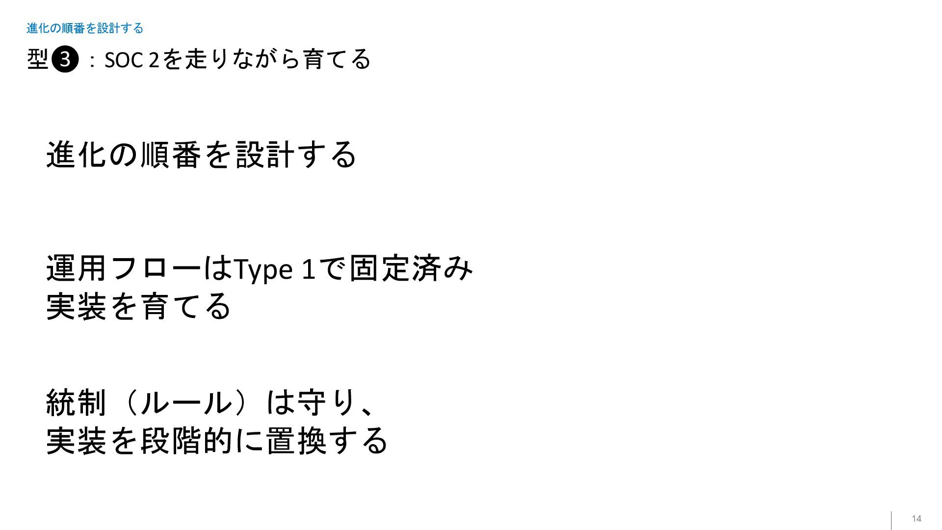 型❸:SOC 2を走りながら育てる 14 進化の順番を設計する 進化の順番を設計する 運用フローはType 1で固定済み 実装を育てる 統制(ルール)は守り、 実装を段階的に置換する
