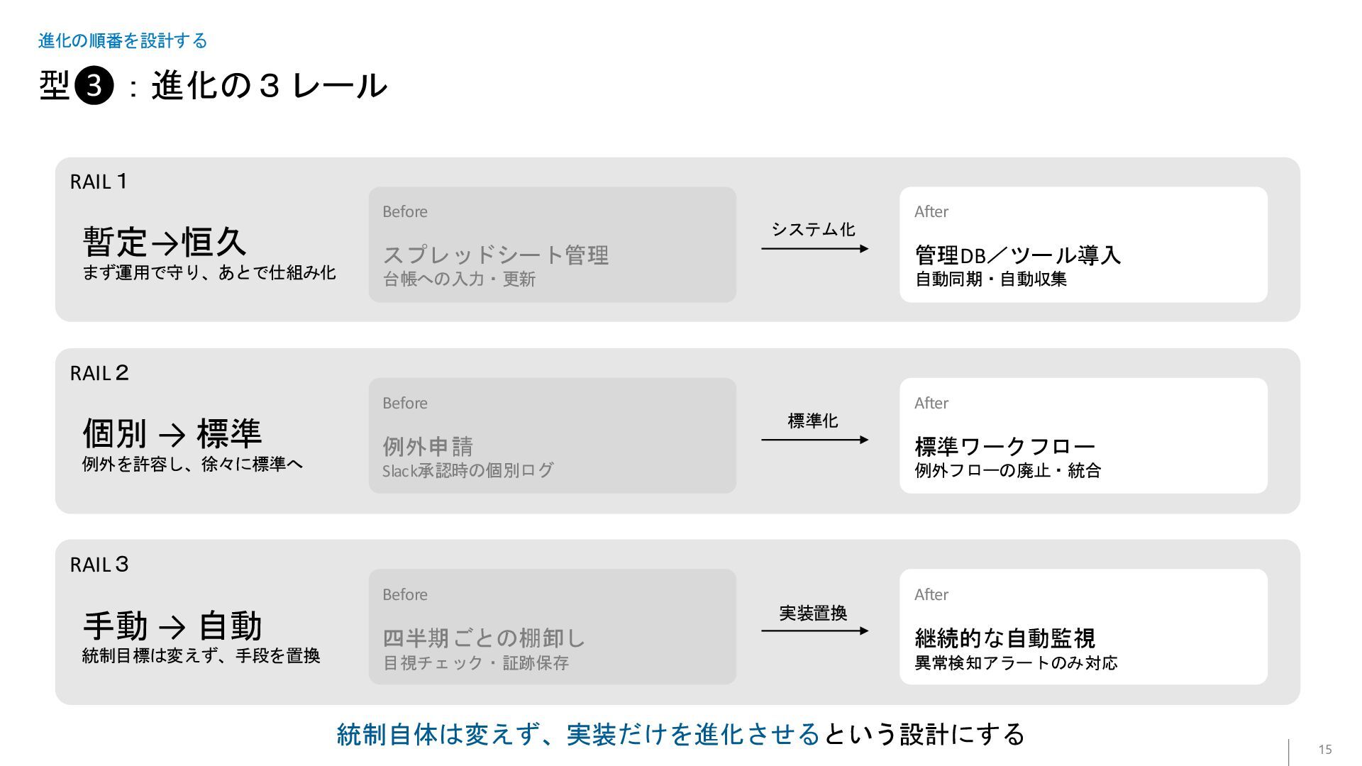 まず運用で守り、あとで仕組み化 After 管理DB/ツール導入 自動同期・自動収集 システム化 RAIL2 Before 例外申請 Slack承認時の個別ログ 個別 → 標準 例外を許容し、徐々に標準へ After 標準ワークフロー 例外フローの廃止・統合 標準化 個別→標準 RAIL3 Before 四半期ごとの棚卸し 目視チェック・証跡保存 手動 → 自動 統制目標は変えず、手段を置換 After 継続的な自動監視 異常検知アラートのみ対応 実装置換 統制自体は変えず、実装だけを進化させるという設計にする