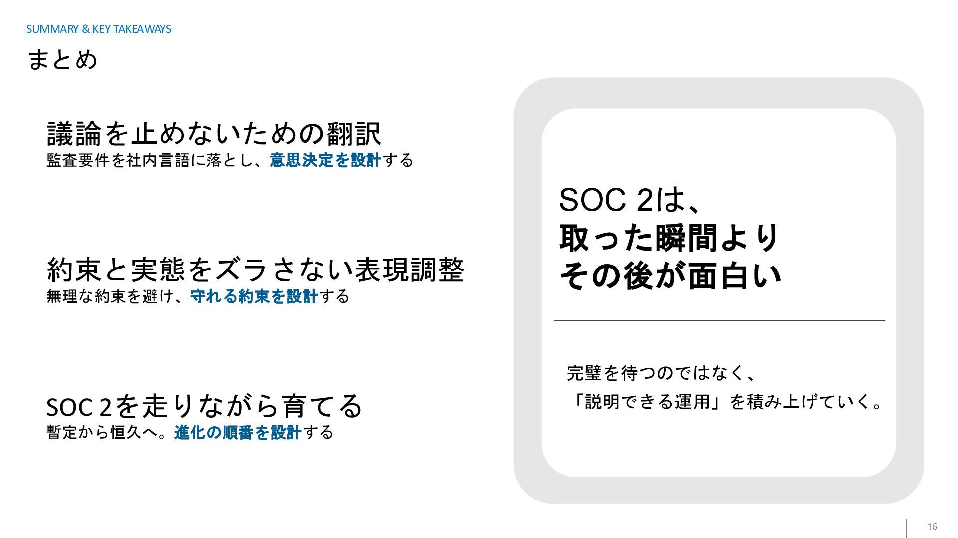 SOC 2を走りながら育てる 暫定から恒久へ。進化の順番を設計する SOC 2は、 取った瞬間より その後が面白い 完璧を待つのではなく、 「説明できる運用」を積み上げていく。