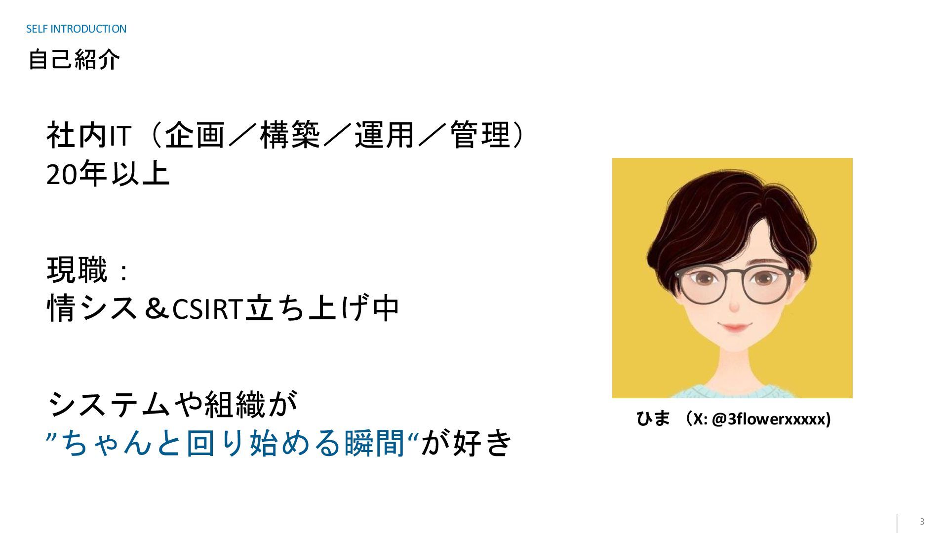 自己紹介 3 SELF INTRODUCTION 社内IT(企画/構築/運用/管理) 20年以上 現職: 情シス&CSIRT立ち上げ中 システムや組織が ”ちゃんと回り始める瞬間“が好き