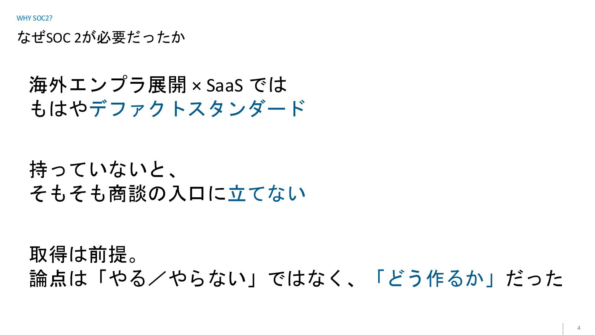 なぜSOC 2が必要だったか 4 WHY SOC2? 海外エンプラ展開 × SaaS では もはやデファクトスタンダード