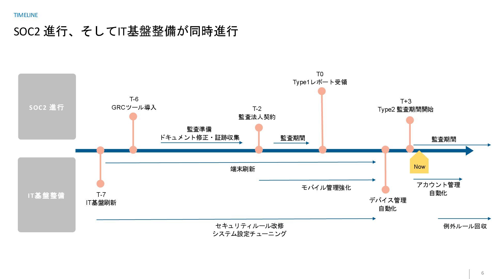 Type2 監査期間開始 アカウント管理 自動化 T-6 GRCツール導入 T-2 監査法人契約 デバイス管理 自動化 監査期間 監査準備 ドキュメント修正・証跡収集 端末刷新 モバイル管理強化 T-7 IT基盤刷新 監査期間 セキュリティルール改修 システム設定チューニング 例外ルール回収 Now