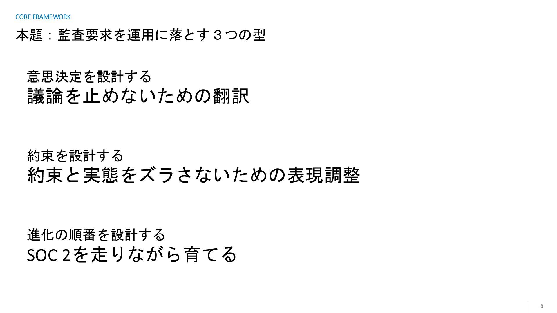 本題:監査要求を運用に落とす3つの型 8 CORE FRAMEWORK 意思決定を設計する 議論を止めないための翻訳 約束を設計する 約束と実態をズラさないための表現調整 進化の順番を設計する SOC
