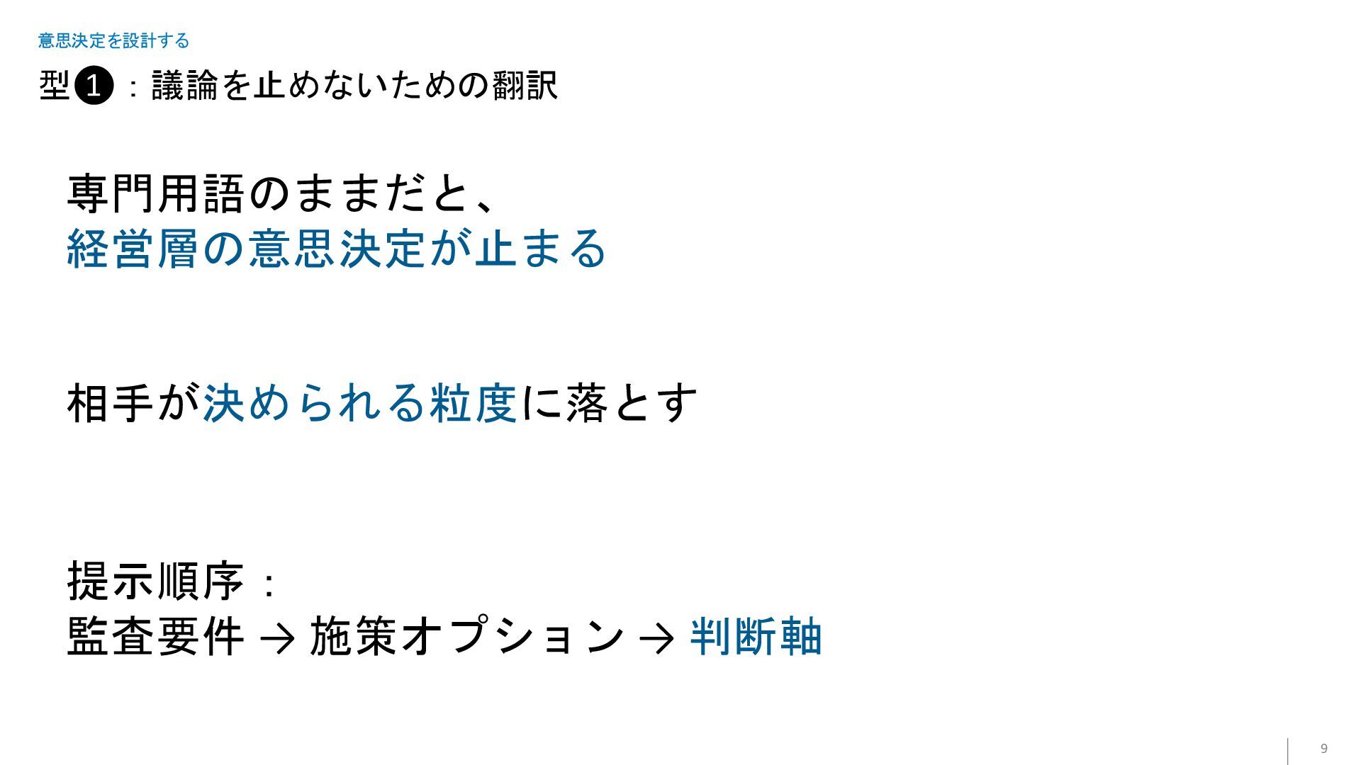型❶:議論を止めないための翻訳 9 意思決定を設計する 専門用語のままだと、 経営層の意思決定が止まる 相手が決められる粒度に落とす 提示順序: 監査要件 → 施策オプション