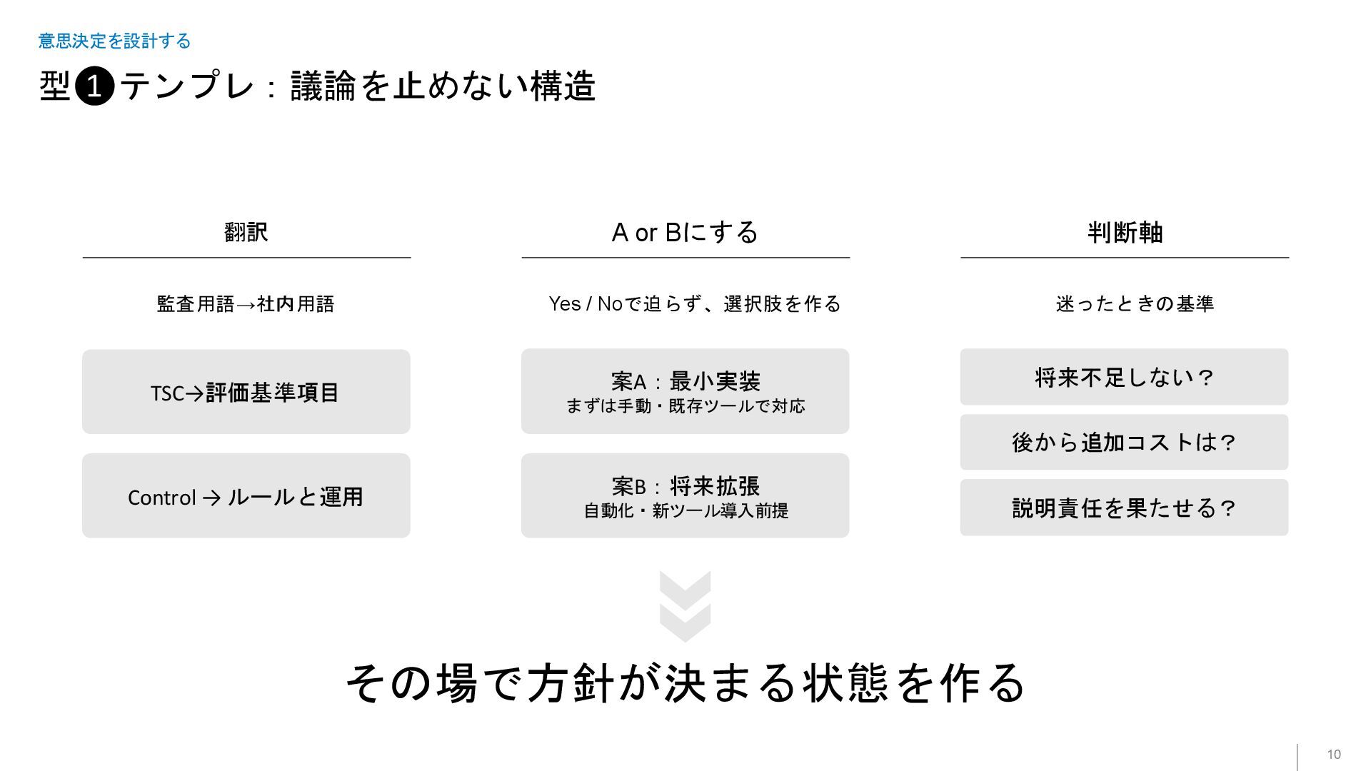型❶テンプレ:議論を止めない構造 10 意思決定を設計する 翻訳 A or Bにする 判断軸 監査用語→社内用語 Yes