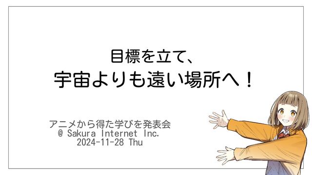 目標を立て、 宇宙よりも遠い場所へ! アニメから得た学びを発表会 @ Sakura Internet Inc. 2024-11-28 Thu